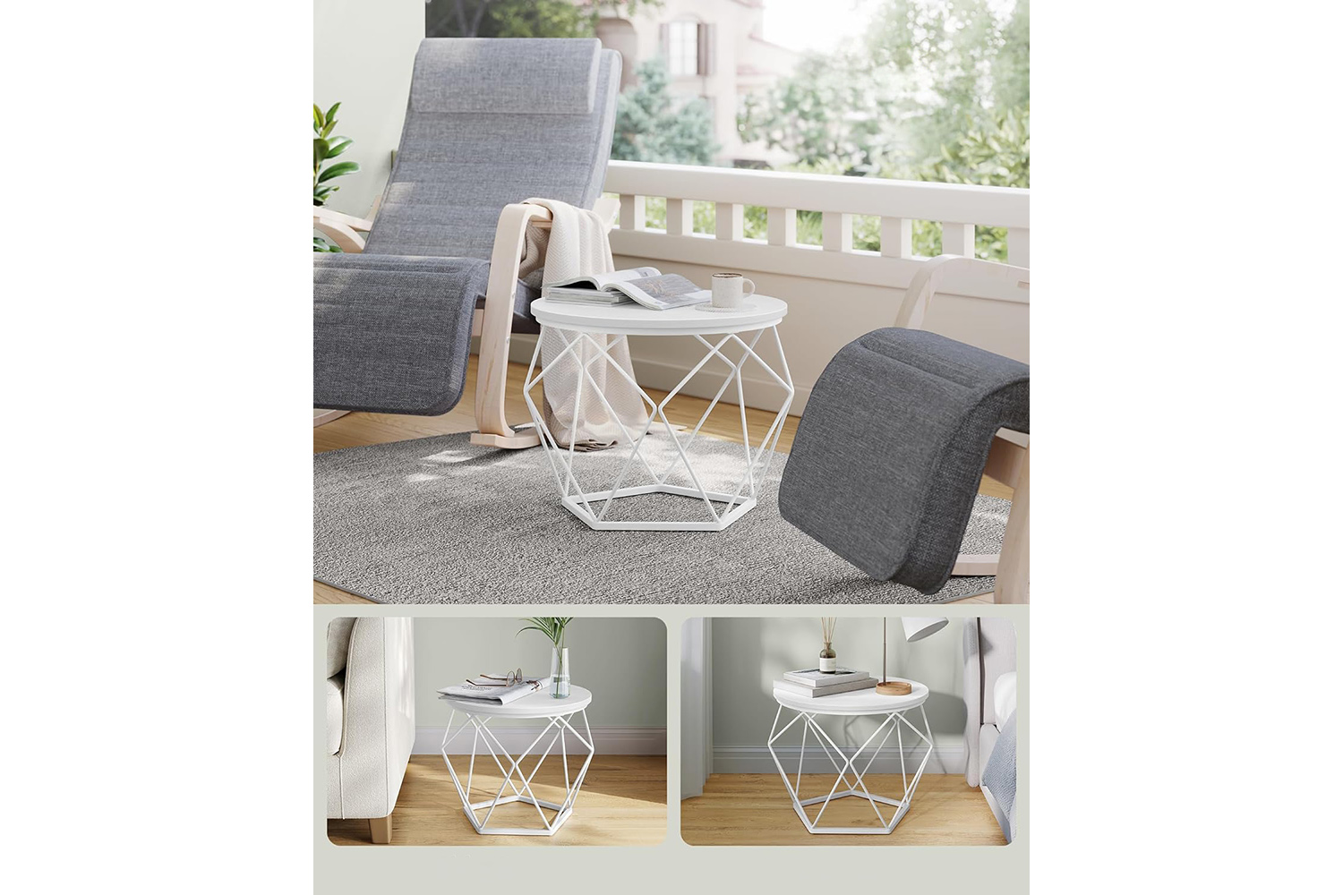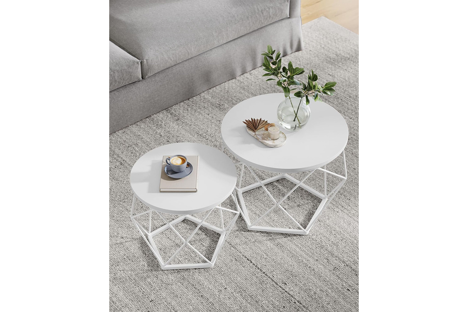 These modern-style coffee tables for your living room bring a special touch to your space with round snow white tops and geometric white steel bases. Their attractive look will impress your guests.