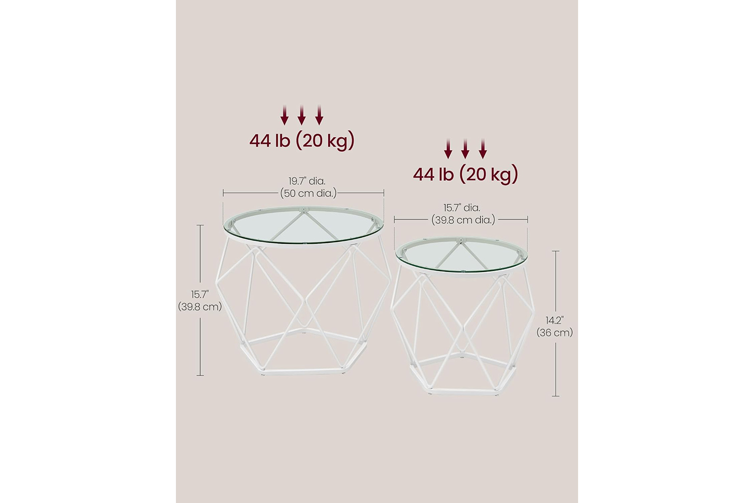 - Size of large table: 19.7"dia. x 15.7"H (50 x 40 cm)