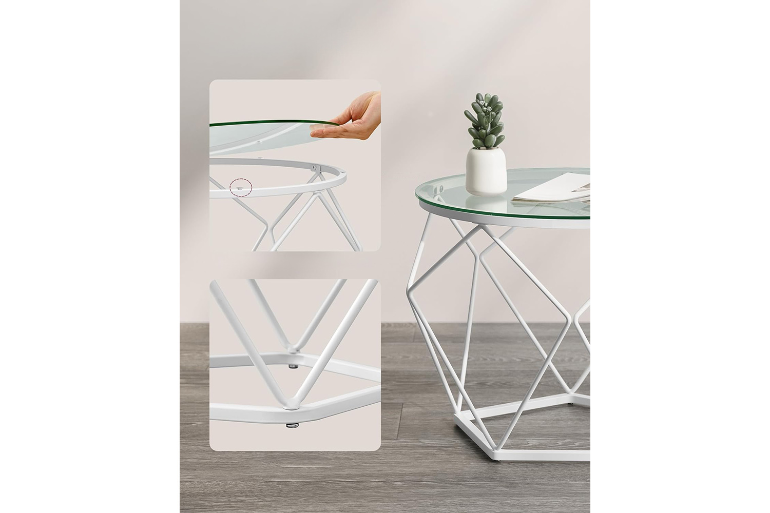 These modern-style coffee tables for your living room bring a special touch to your space with round transparent tops and geometric white steel bases. Their attractive look will impress your guests.