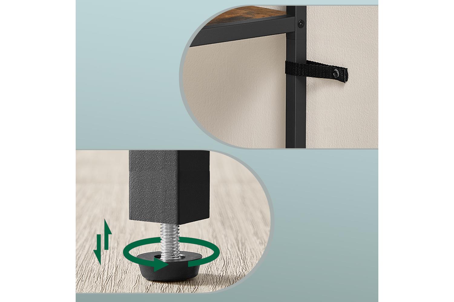 - Material: Chipboard shelves with rustic brown finish, black steel frame