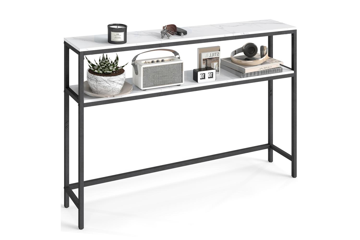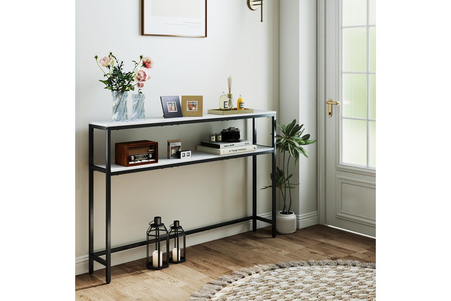 Designed with a sleek black steel frame and a marbled white chipboard finish, this console table brings a touch of contemporary elegance to any room. The clean lines and minimalist look make it a versatile addition, whether you are looking to enhance your hallway, create a stylish spot for your keys and post, or display your favourite plants and decorative pieces. The modern aesthetic is sure to complement a wide range of Irish interiors, from city apartments to cosy countryside homes.