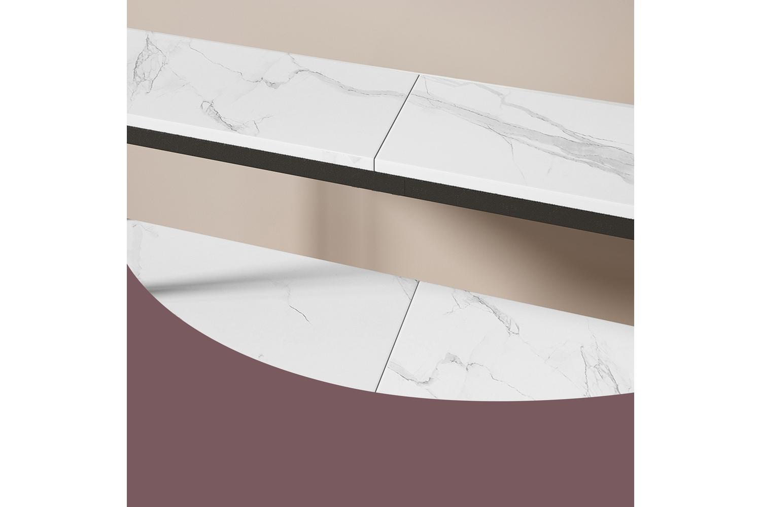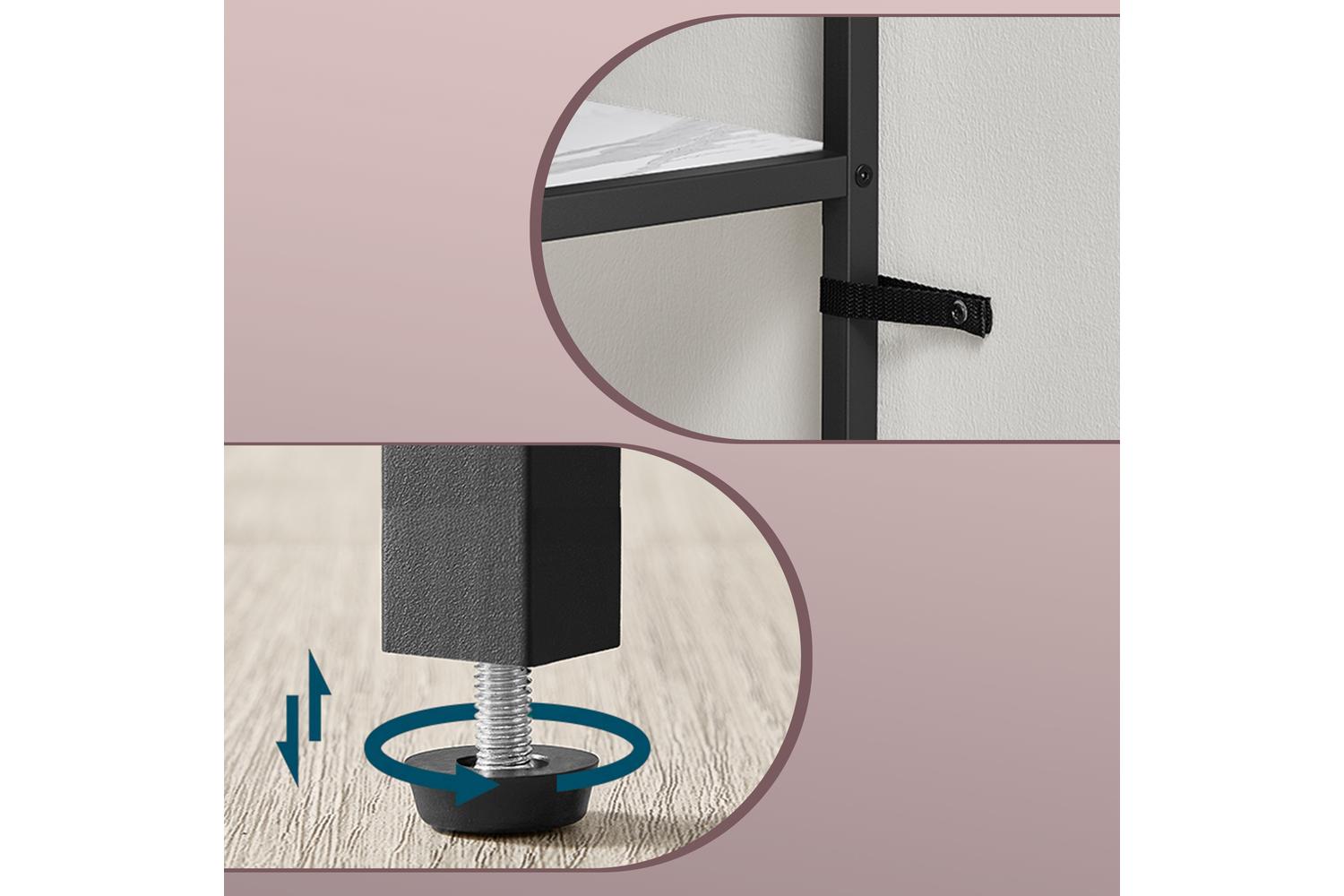 - Modern design: Sleek black steel frame with marbled white chipboard shelves