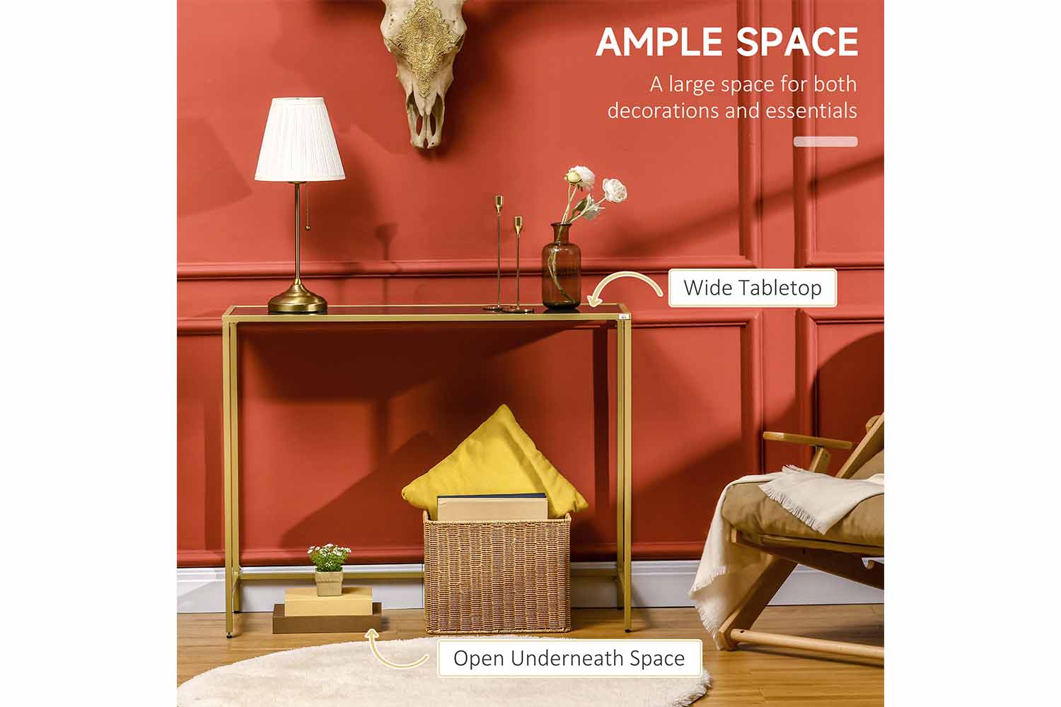 Blending style and storage function together, this sofa console table from Homcom is a distinctive piece of furniture you'll love having at home. Homcom console tables for hallway feature a spacious desktop to display photos, ornaments, keys or earrings and the open space underneath for you to place several container box or shoes. Tempered glass tabletop and solid steel frame ensure your stable daily use. Embrace industrial chic in your living room, bedroom, and entryway.