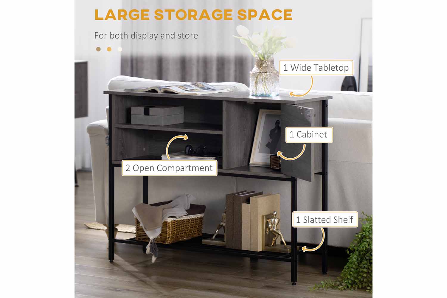 Are you looking for storage solutions and a decorative update for your entryway? Homcom slim console table with storage is an ideal solution. Features a large desktop to display photographs, knick-knacks, and much more, the two open shelves underneath for you to place to-go essentials, and can use the cabinet to store assorted items out of sight, furthermore, the bottom slatted shelf is designed for shoe storage. Take your home to the next level with this beautiful entryway table.