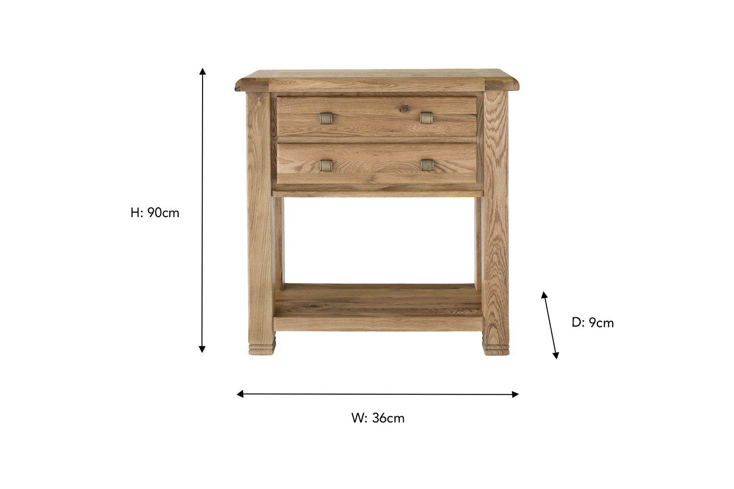 Crafted from oak wood with a natural finish, the Savannah console table radiates a warmth and comfort that only wood designs provide. The ideal table for any room in the house, this item provides ample space for decorative pieces you want to show off. It includes two small drawers perfect for storing essential items in an easy to reach place, and a shelf below for extra storage space. The stepped detailing on the legs and muted hues gives this table a rich finish.