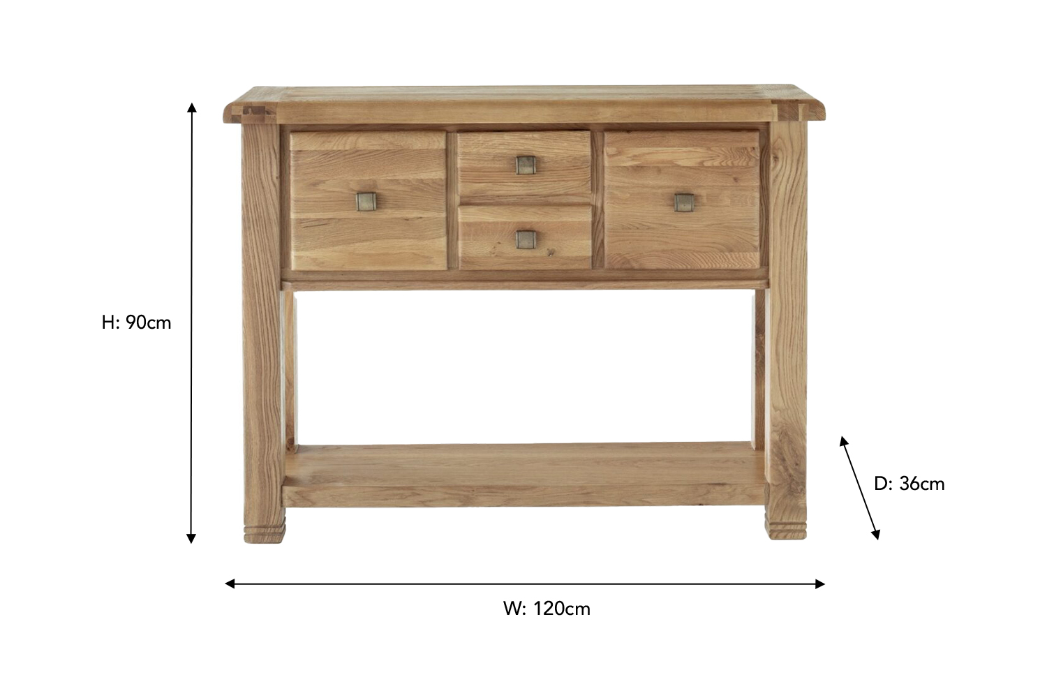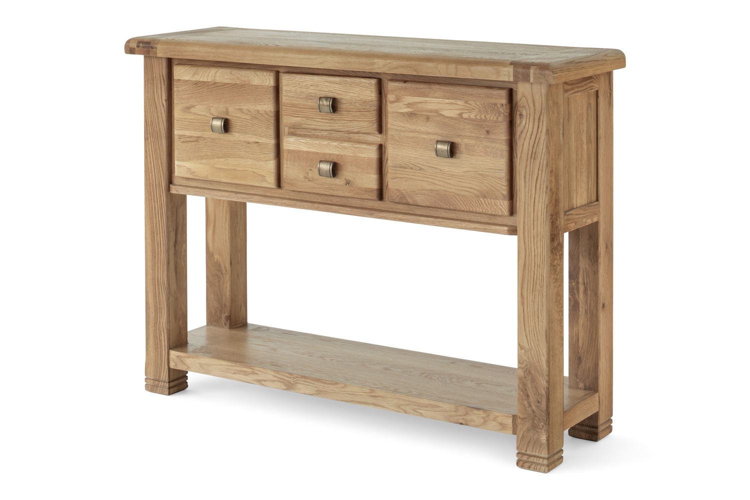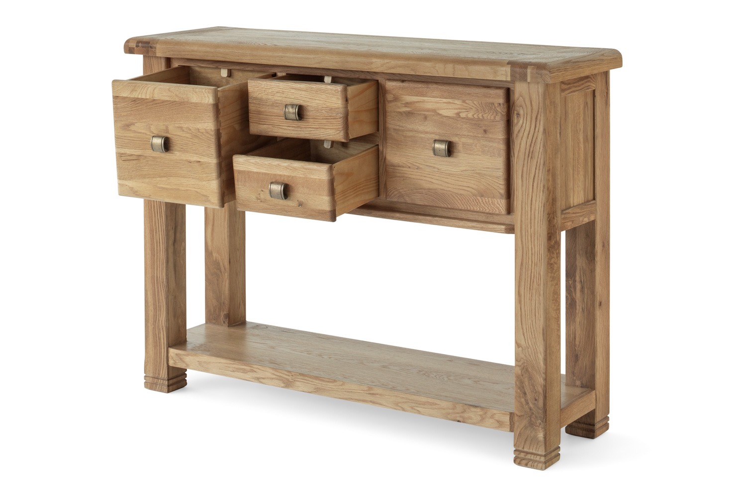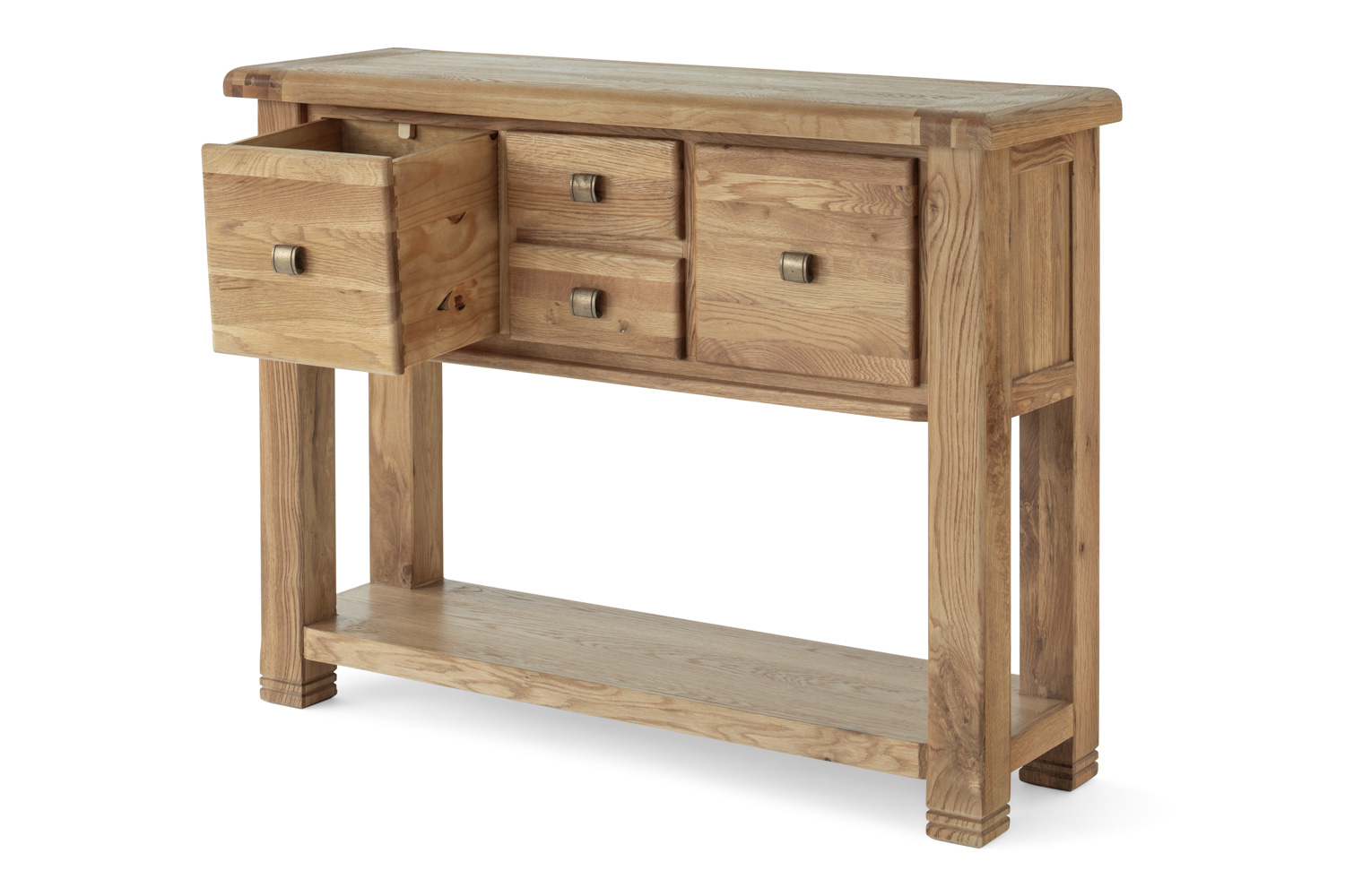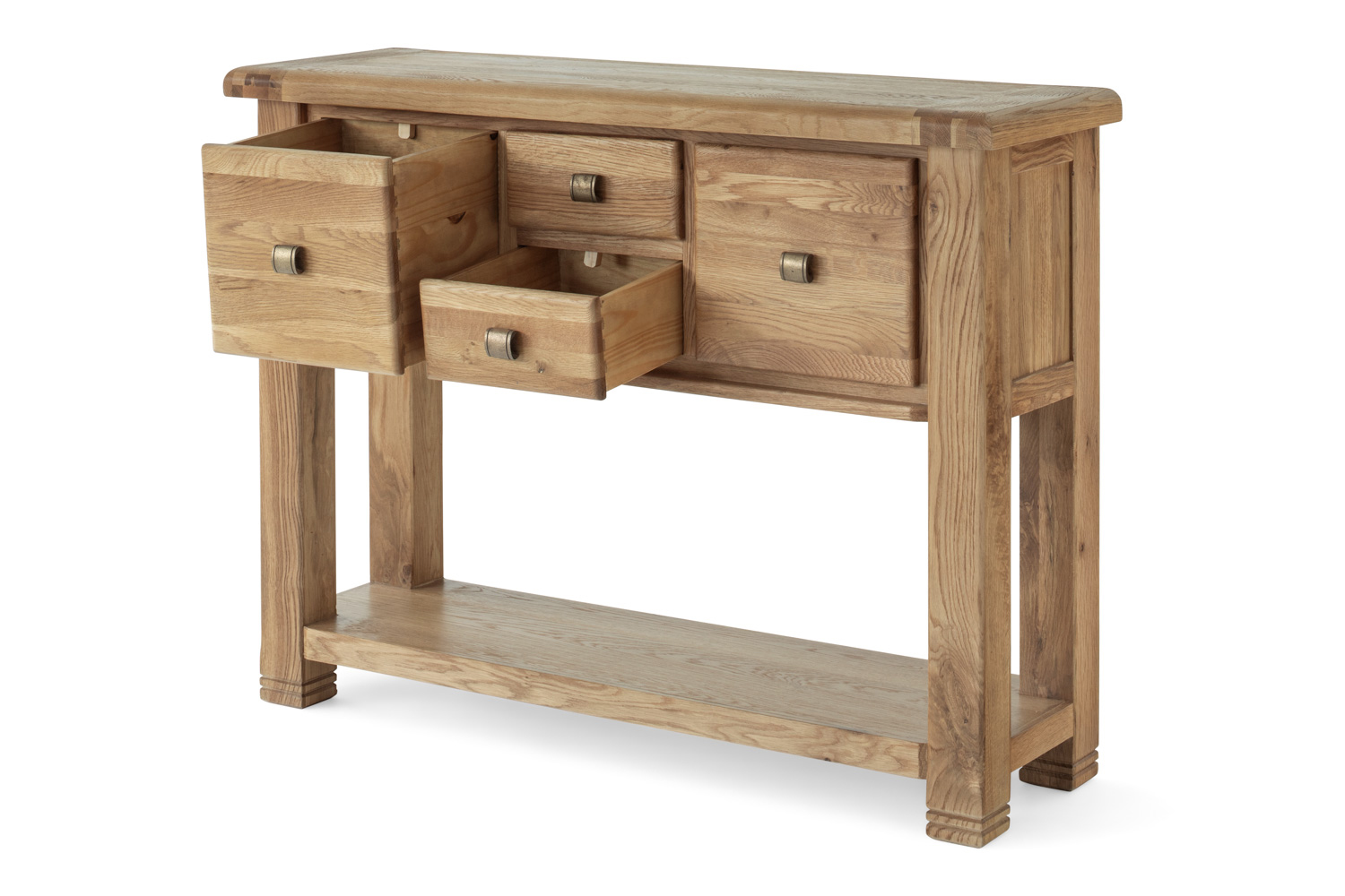 Crafted from oak wood with a natural finish, the Savannah console table radiates a warmth and comfort that only wood designs provide. The ideal table for any room in the house, this item provides ample space for decorative pieces you want to show off. It includes two small drawers and two bigger drawers perfect for storing essential items in an easy to reach place, and a shelf below for extra storage space. The stepped detailing on the legs and muted hues gives this table a rich finish.