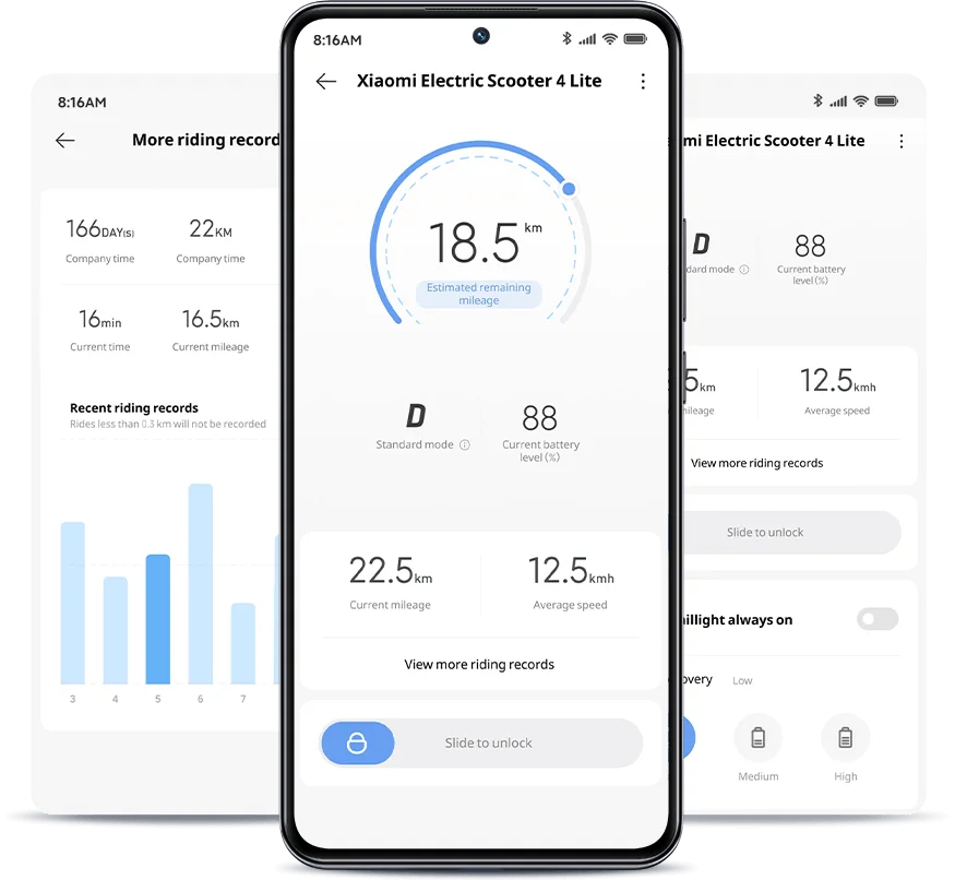 *Walking mode: 6km/h. Standard mode: 20km/h. Sport mode: 25km/h. Total load: 75±5kg. Battery capacity: 70%±10%. The Xiaomi Electric Scooter 4 Lite has accelerated driving in auxiliary driving zone at the room temperature (25±5)℃ and meanwhile wind speed ≤3m/s. Its top speed is maintained in the test zone. The top speed in test zone is measured respectively through the tachometer or Bluetooth and display. Data from Brightway's Lab.
