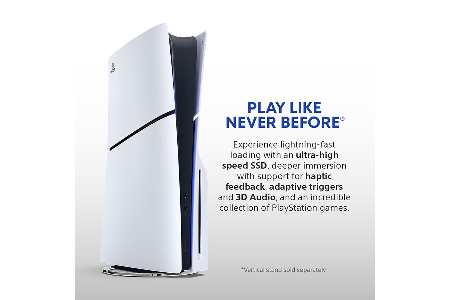 Experience lightning fast loading with an ultra-high speed SSD, deeper immersion with support for haptic feedback, adaptive triggers, and 3D Audio[1], and an all-new generation of incredible PlayStation games.