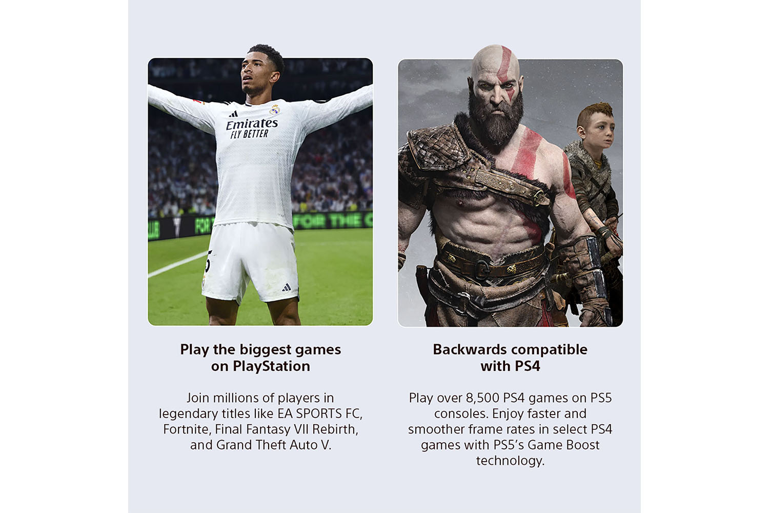 The PS5 console can play over 8,500 PS4 games. With the Game Boost feature, you can even enjoy faster and smoother frame rates in some of the PS4 console’s greatest games.