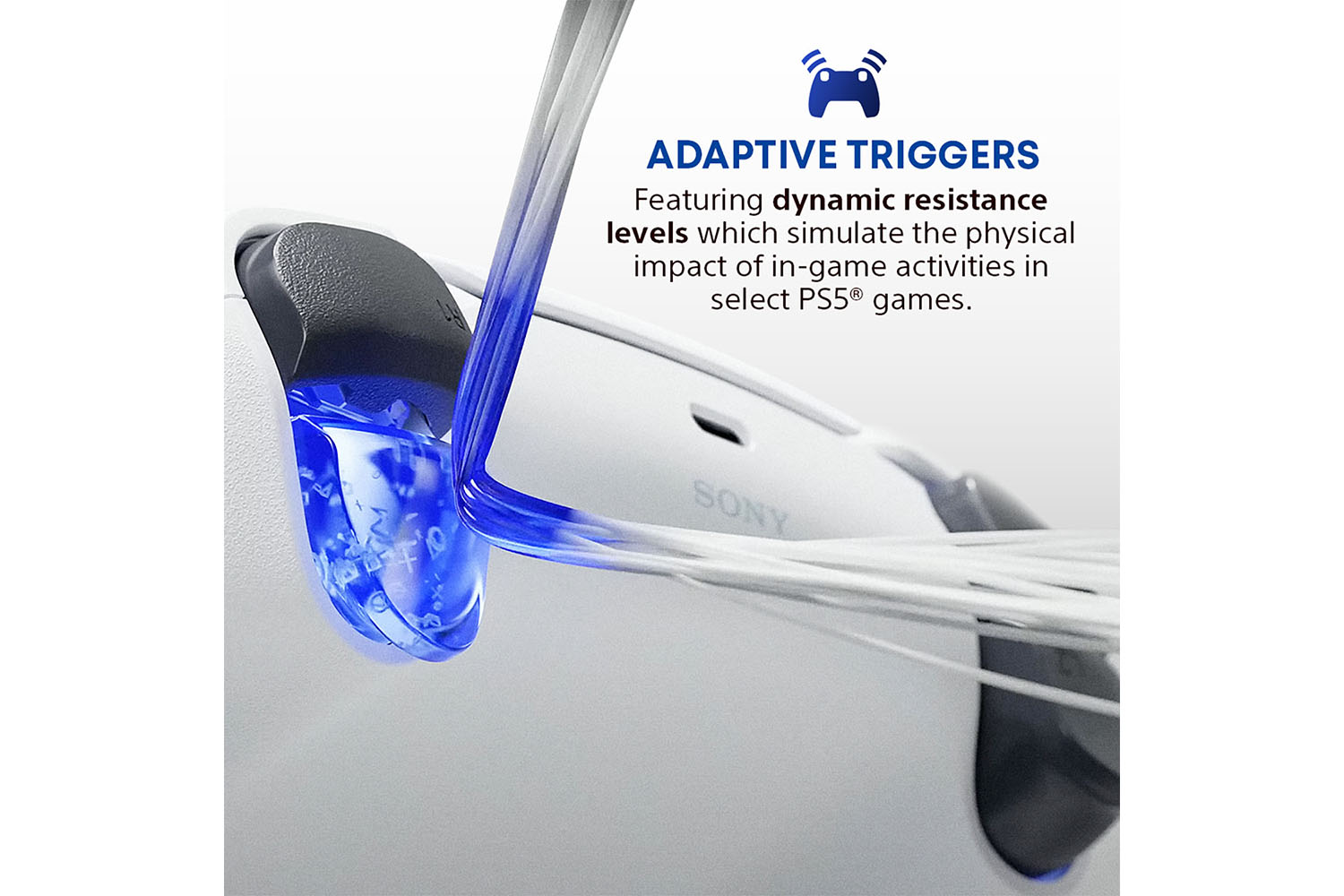 Get to grips with immersive adaptive triggers, featuring dynamic resistance levels which simulate the physical impact of in-game activities in select PS5 games.