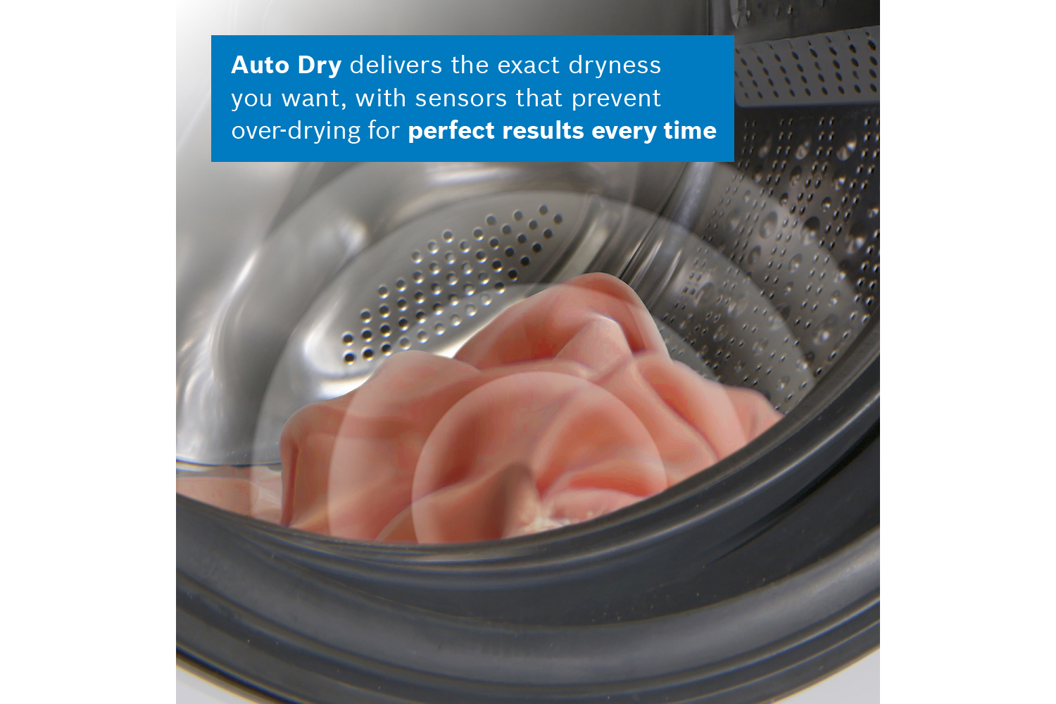 Load up your laundry and Auto Dry will finish it to the exact level of dryness you want – whether that's dry enough to iron or extra-dry and ready to fold. Its sensors constantly measure the temperature and moisture to protect your laundry from high temperatures and over-drying. Get the perfect dry every time.