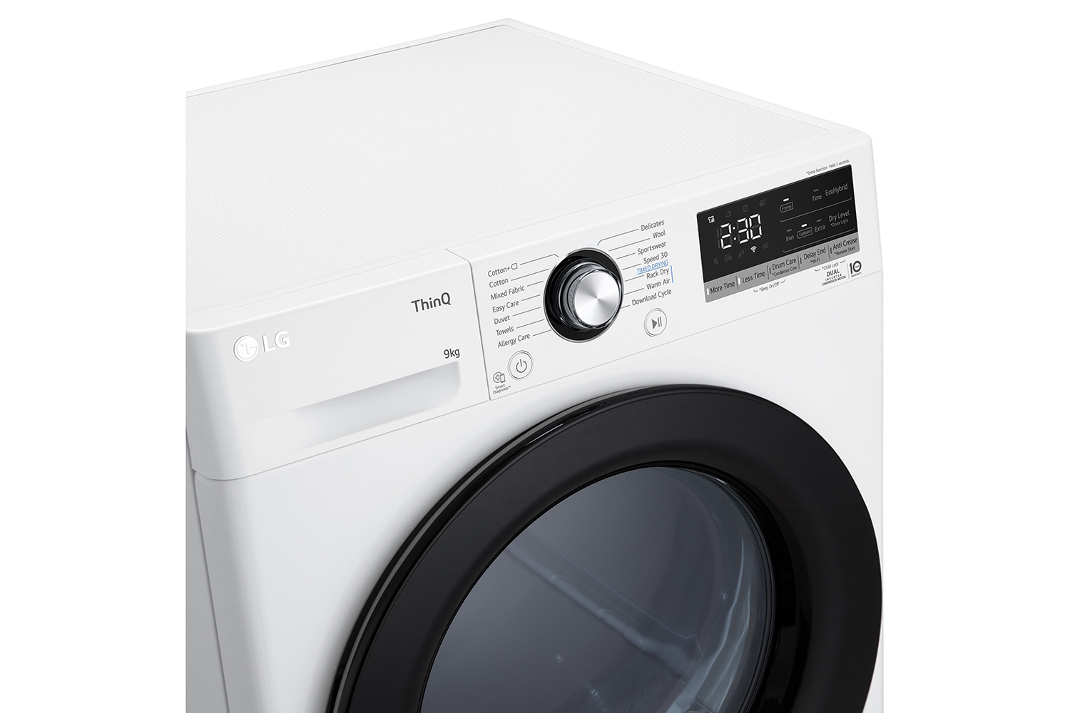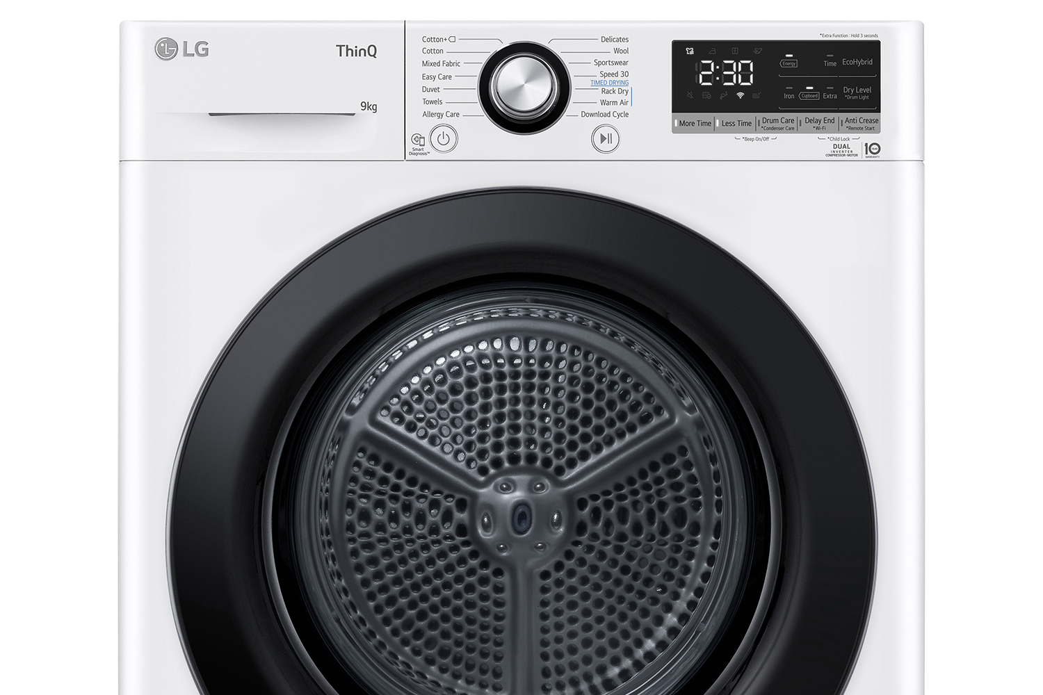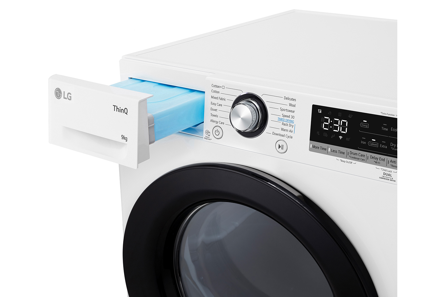 The LG FDV309WN Dryer is the perfect companion to any washing machine set-up, boasting LG’s unique DUAL Inverter Heat Pump at its core which consumes less energy without sacrificing cycle quality. The DUAL Dry™ design also means you can switch between a more eco-friendly cycle, and one that can dry your clothes quickly – perfect for when you’re in a hurry. With LG’s DUAL Dry™ system, freedom of choice is always available. Plus, with LG’s Auto Cleaning Condenser, you won’t have to worry about difficult cleaning on a regular basis – it’ll happen for you, giving you more time to enjoy the things you love. With the added Smart Pairing feature compatible LG washing machines will share cycle data directly to the dryer, simplifying use and giving your clothes the care they deserve.
