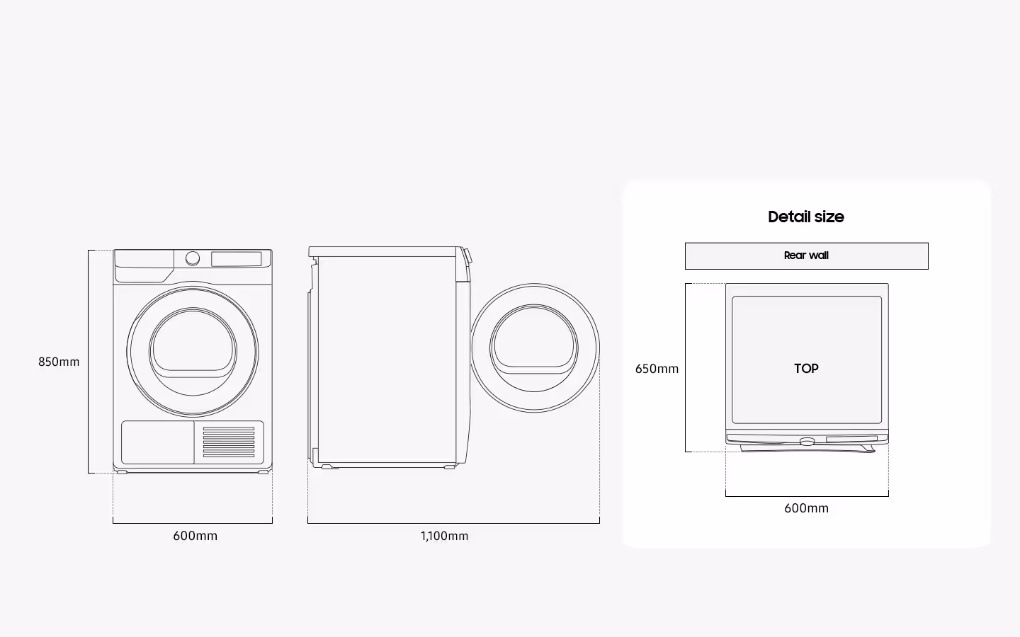 * Based on an AI-created algorithm. ** Based on internal testing on the DV9400B model, using the Cotton and AI Dry cycle to dry a mixed 2kg load with 43% moisture content, compared to a conventional Samsung model, DV5000T. Result: energy consumption is reduced by 10%.*** Based on internal testing on the DV9400B model, using the Cotton and AI Dry cycle to dry a mixed 2kg load with 57% moisture content, compared to a conventional Samsung model, DV5000T. Result: the cycle time is reduced by 15%. Results may vary depending on the actual usage conditions.