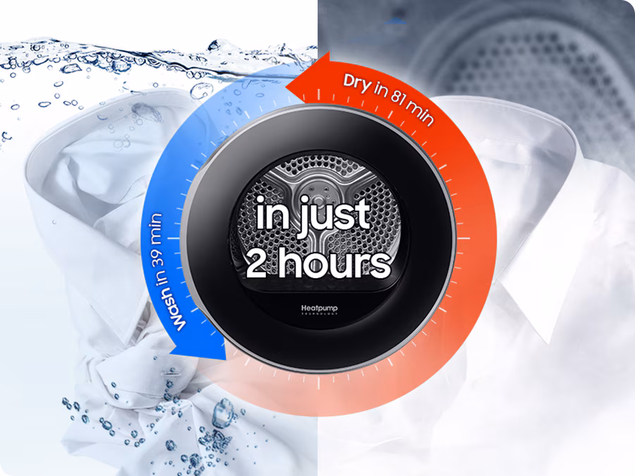 Get clothes clean and ready to wear in just 2 hours, while saving energy. The Super Speed course can dry a mixed load of cotton and synthetics in 81 minutes*. And with a Super Speed washing machine you can wash and spin clothes in 39 minutes*. So garments can be washed and dried in 2 hours.