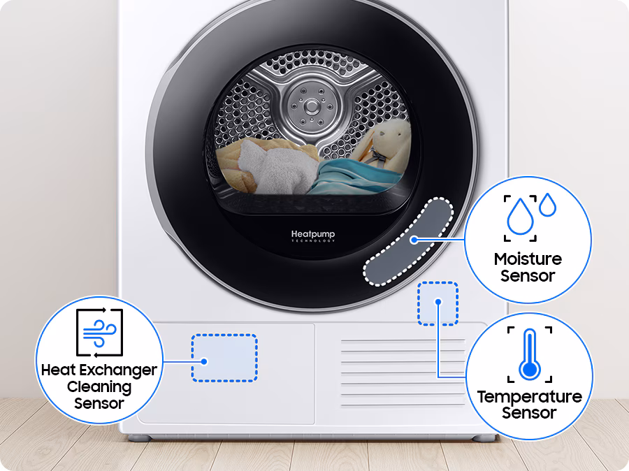 Enhance your drying performance effortlessly! OptimalDry uses 3 sensors to dry clothes effectively. It monitors the humidity level and adjusts the drying time, so laundry is ready quickly, while saving energy. It also stops clothes from being damaged and reminds you to clean the Heat Exchanger.