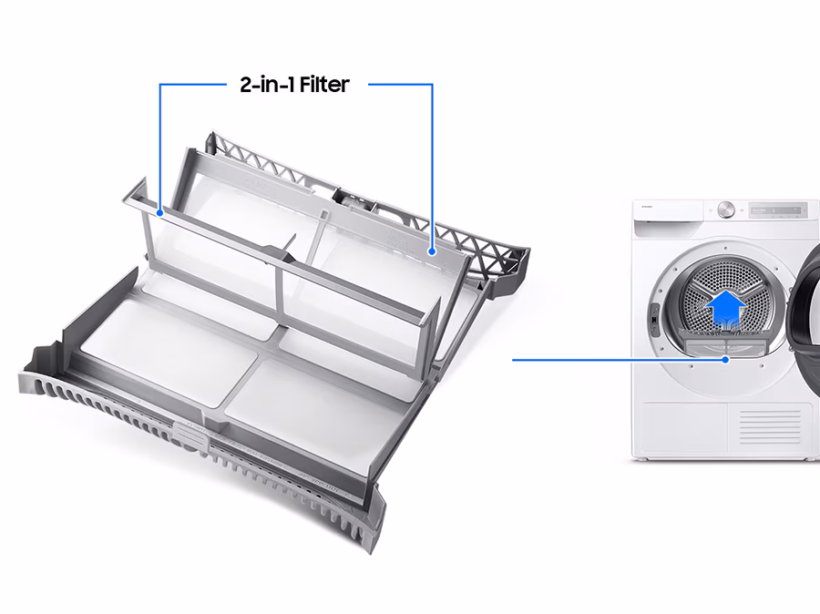 Maintain your dryer easily and enhance the drying performance. A 2-in-1 Filter has a two-layered mesh filter that captures dust and fibers. So there is no need for a Heat Exchanger filter, making it easy to maintain. Two alarms also remind you when the Filter and Heat Exchanger need cleaning.