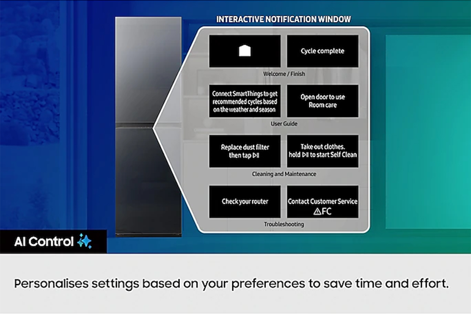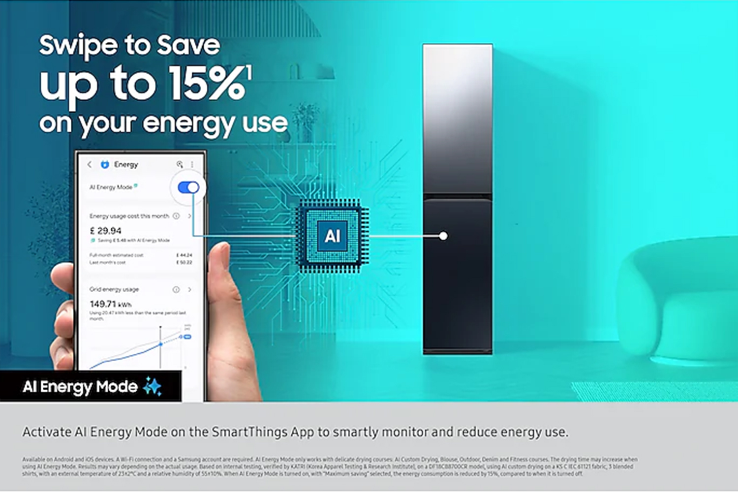 * Available on Android and iOS devices. A Wi-Fi connection and a Samsung account are required.** Al Energy Mode only works with delicate drying courses: Al Custom