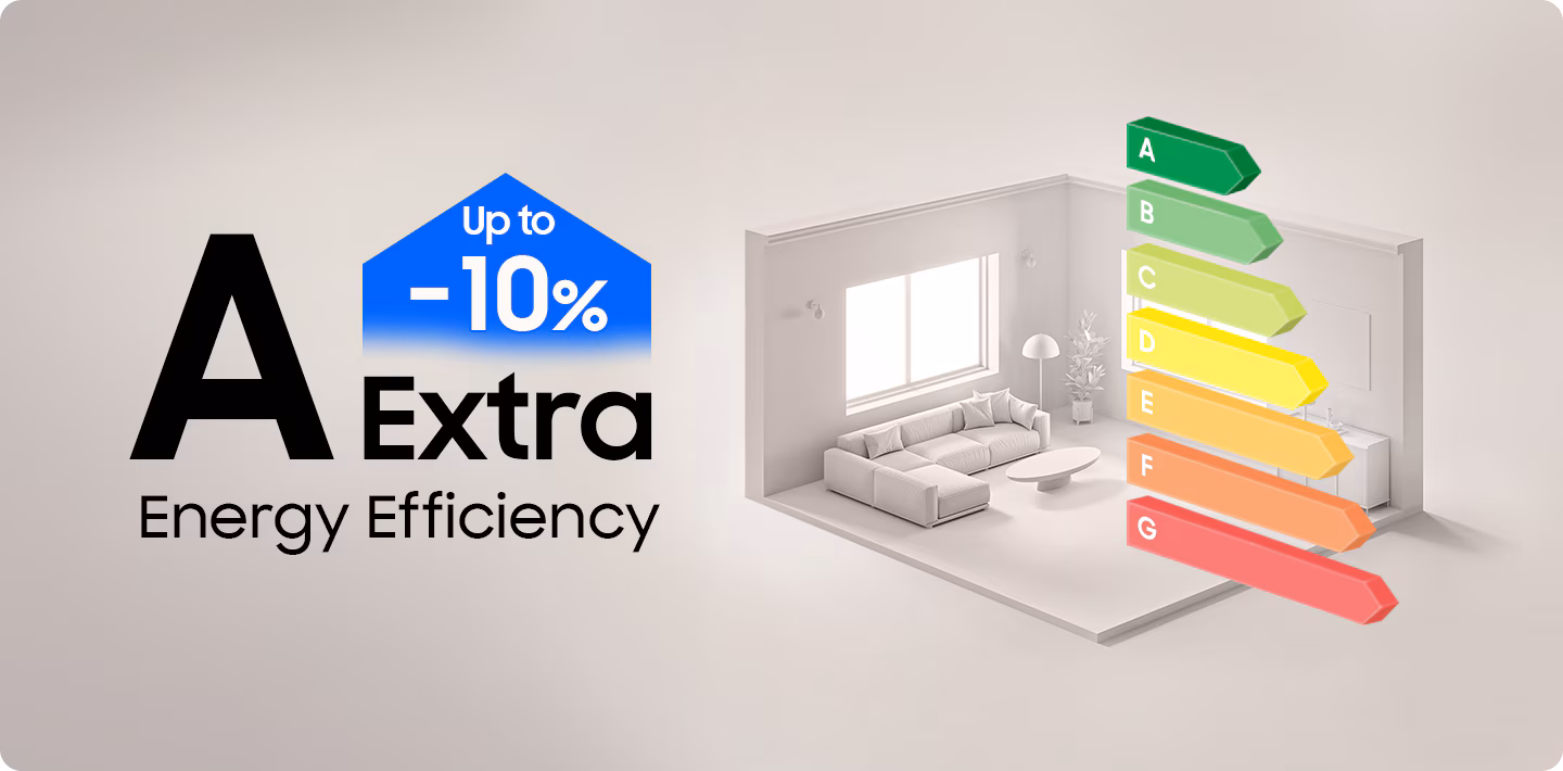 * Based on Samsung internal testing. The energy consumption of this 9KG model is 45Wh / 100 cycles, which is 10% more energy efficient compared to the minimum threshold of energy efficiency class A (50kWh / 100 cycles for 9KG models). Energy ratings tested with Eco 40-60 program, 10% savings tested with Eco 40-60 program.