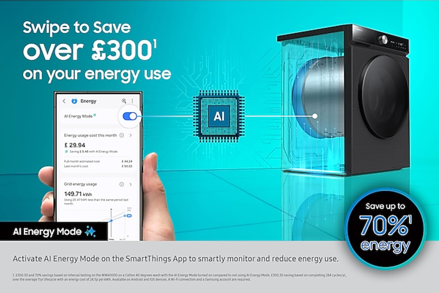 Samsung washer dryers with Al energy mode* can reduce your energy consumption by up to 70%**.