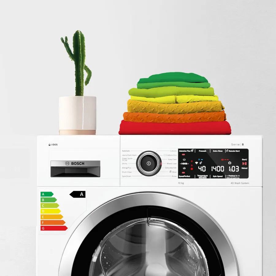 All Bosch washing machines are A-rated, built with sustainability in mind. By using energy-saving home appliances, you save valuable resources. That’s why you should consider low energy and water consumption when you purchase a home appliance. We know performance is still important, which is why our A-rated models are still packed with all of your favourite features. The energy label, specifies the efficiency class, noise level, capacity, energy and water consumption of the relevant appliance. Efficiency class for washing machines ranges from A to G.