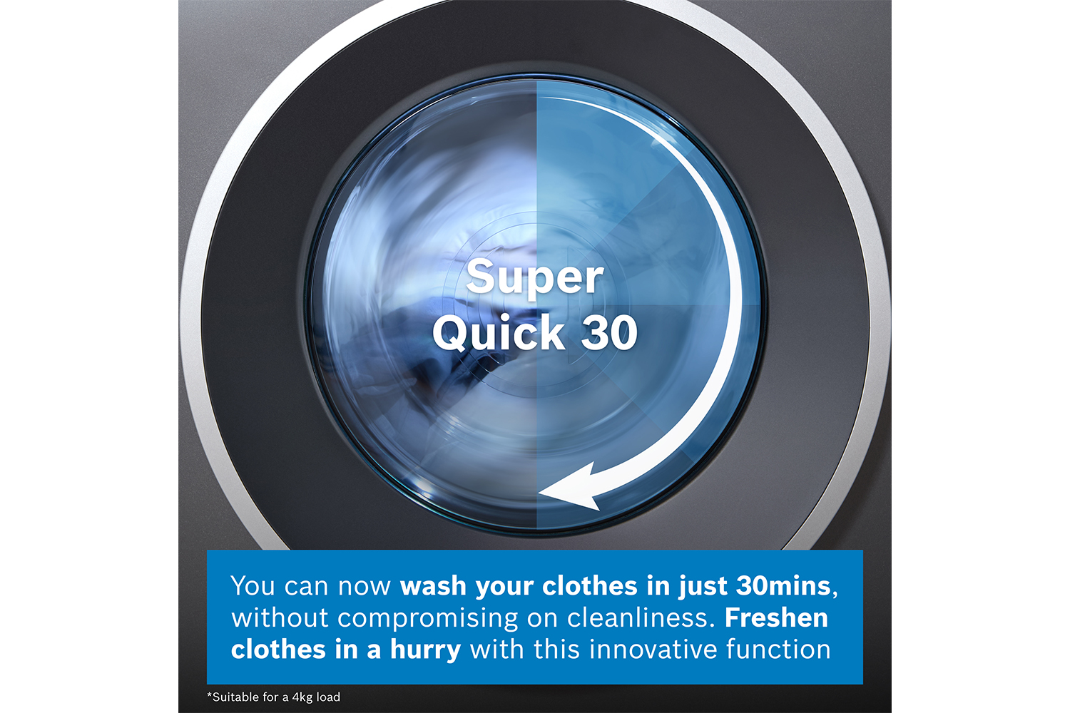 With Super Quick 30, you can now wash your clothes in just 30 minutes, without compromising on cleanliness . Whether you have a last-minute event or simply need your clothes freshened up in a hurry, this innovative function has got you covered. Designed to deliver outstanding results, Super Quick 30 ensures that your clothes are thoroughly cleaned and ready to wear in no time. Experience the convenience and effectiveness of Bosch's Super Quick 30 and make your laundry routine faster and more efficient than ever before. *suitable for a 4kg load