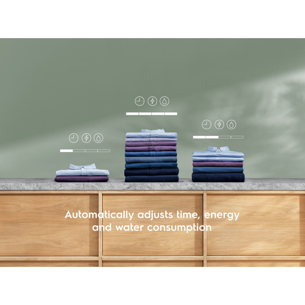 The SensiCare System matches each programme’s settings to load size. Smart sensors reduce the time, water and energy used by up to 30%* for efficient washing—without unnecessary wear and tear on your clothes.*Internal test for time, water and energy consumption of a 30°C Cotton cycle optimized with SensiCare for a 1kg load vs. maximum load.