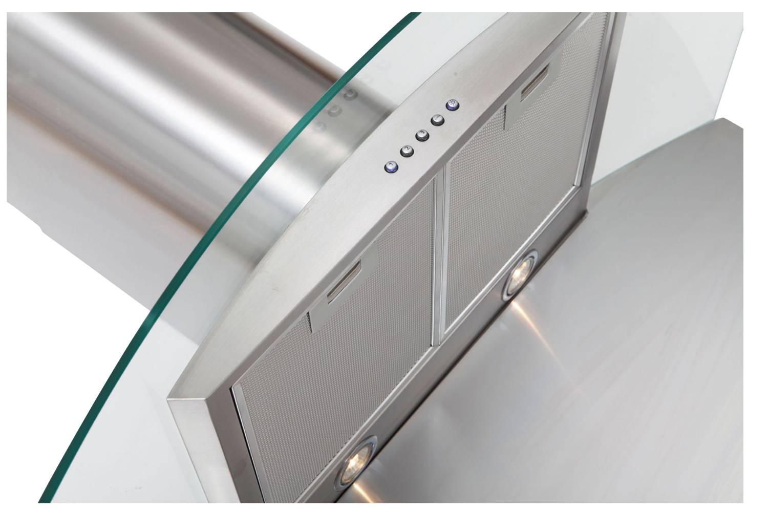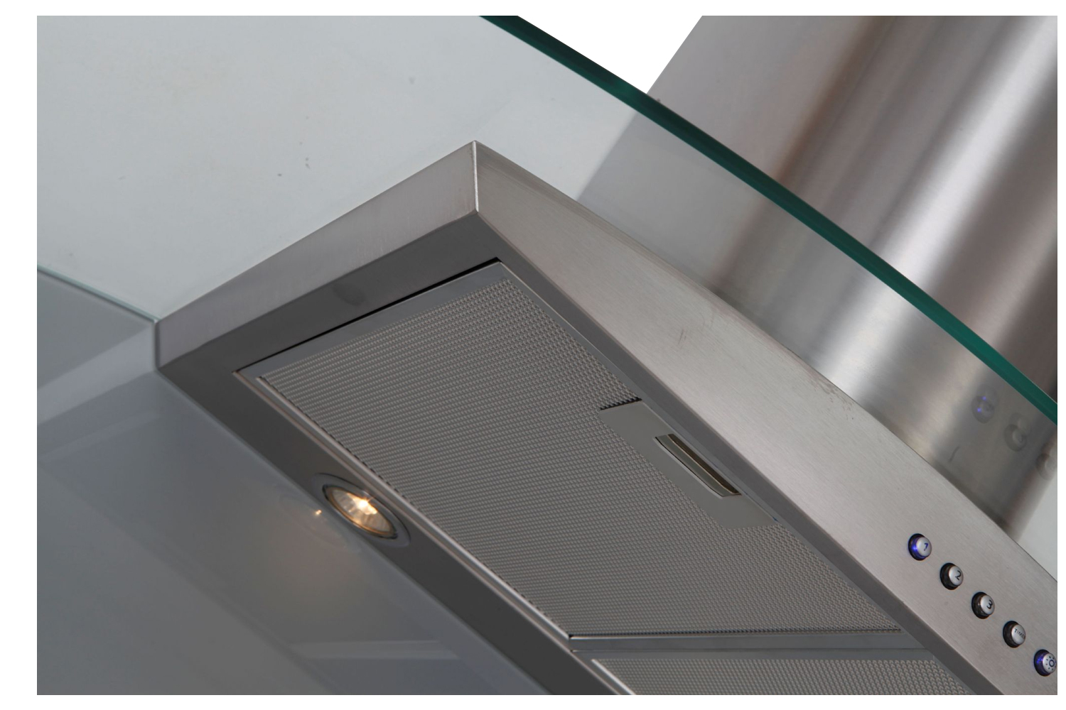 This designer cooker hood comes with two 1.3w LED lights and very high extraction rates of 850m³/hr, the glass is 8mm safety glass and the cooker hood body is fully welded and hand finished in brushed 18/10 grade stainless steel.