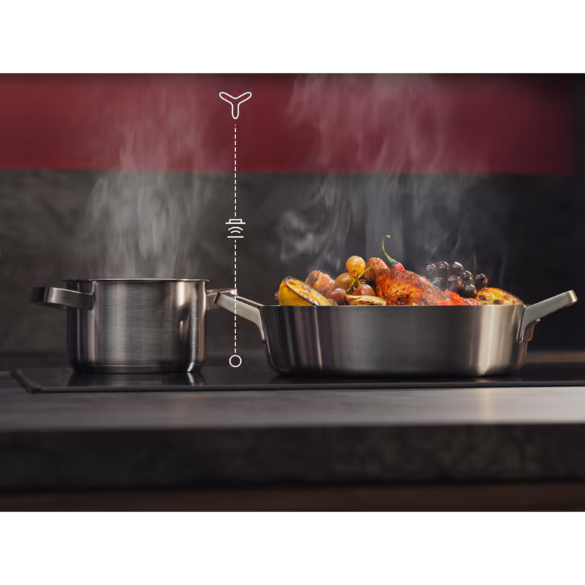 The Hob2Hood function connects the hob and the hood. The cooker hood automatically adjusts the fan speed based on the heat, without lifting a finger. For powerful extraction when searing. And quieter extraction when simmering.