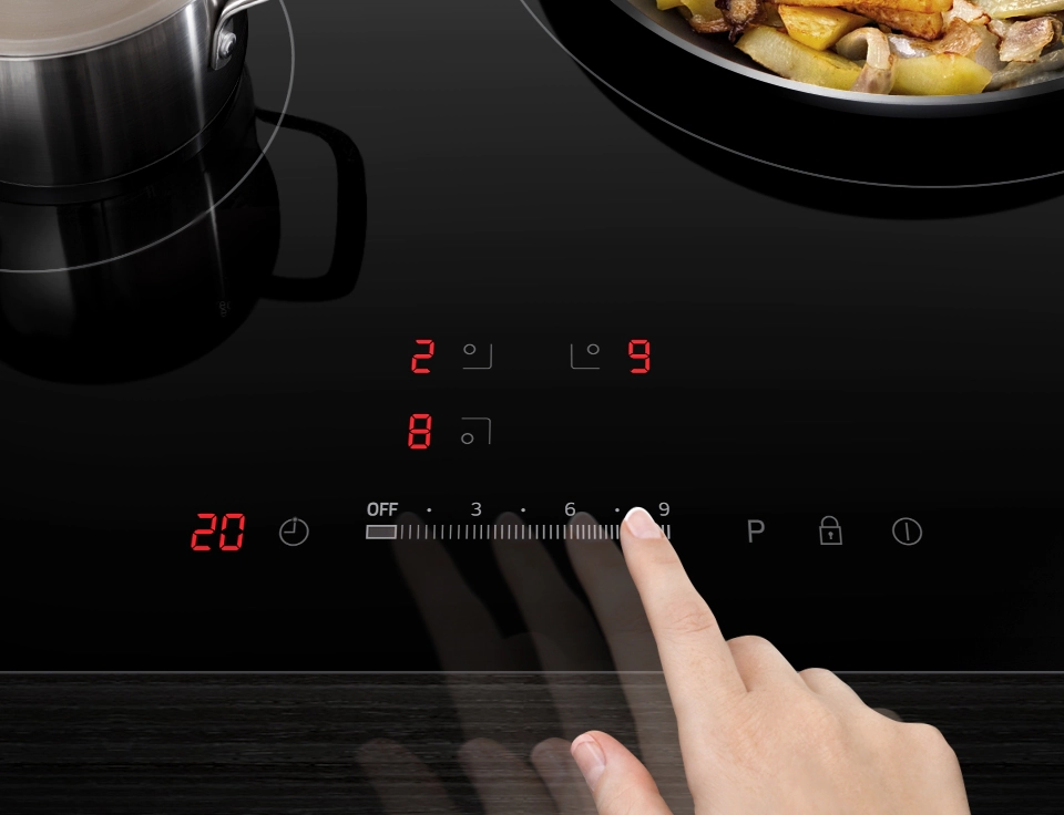 The extra wide and intuitive Sliding Control of the Samsung Induction Cooktop’s enables fast and precise control of your cooking temperatures. You can simply touch and glide your finger across the LED control panel to instantly set or adjust the heat level for each cooking zone with one easy motion. And because its almost twice the width of conventional controls you can be very exact with your settings.