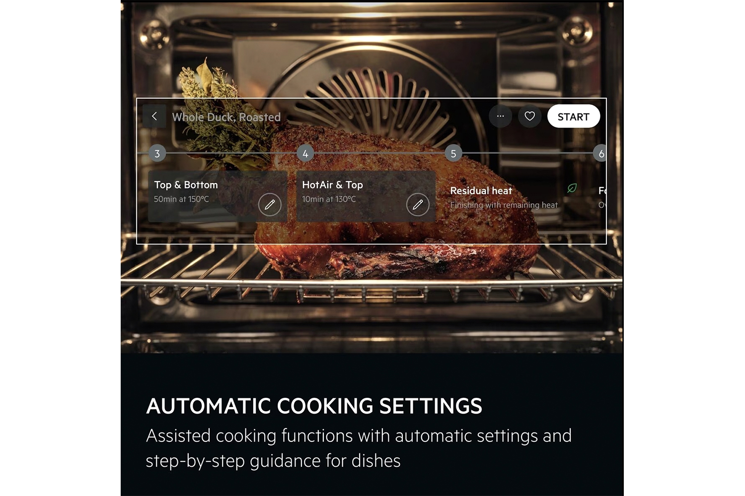 Assisted cooking Functions provide the best settings and automatic options such as Roast, Reheat and Dough Prove for outstanding results. And the Assisted Dishes function offers step-by-step guidance for meat, baking, cooking plant-based dishes, fish or vegetables.