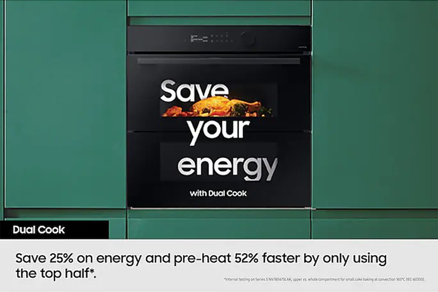 *NV7B5675LAK model tested. Total energy consumption is reduced by 25.3% and the cooking time is reduced by 22.7%, according to internal test results based on the IEC- 60350 test protocol (small cakes, convection 165℃, compared to whole compartment). Actual savings will vary depending on the cooking item, usage and other factors.