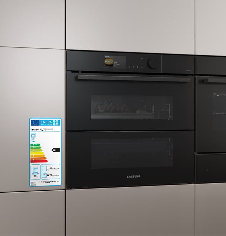 *NV7B5675LAK model tested. Total energy consumption is reduced by 25.3% and the cooking time is reduced by 22.7%, according to internal test results based on the IEC- 60350 test protocol (small cakes, convection 165℃, compared to whole compartment). Actual savings will vary depending on the cooking item, usage and other factors.