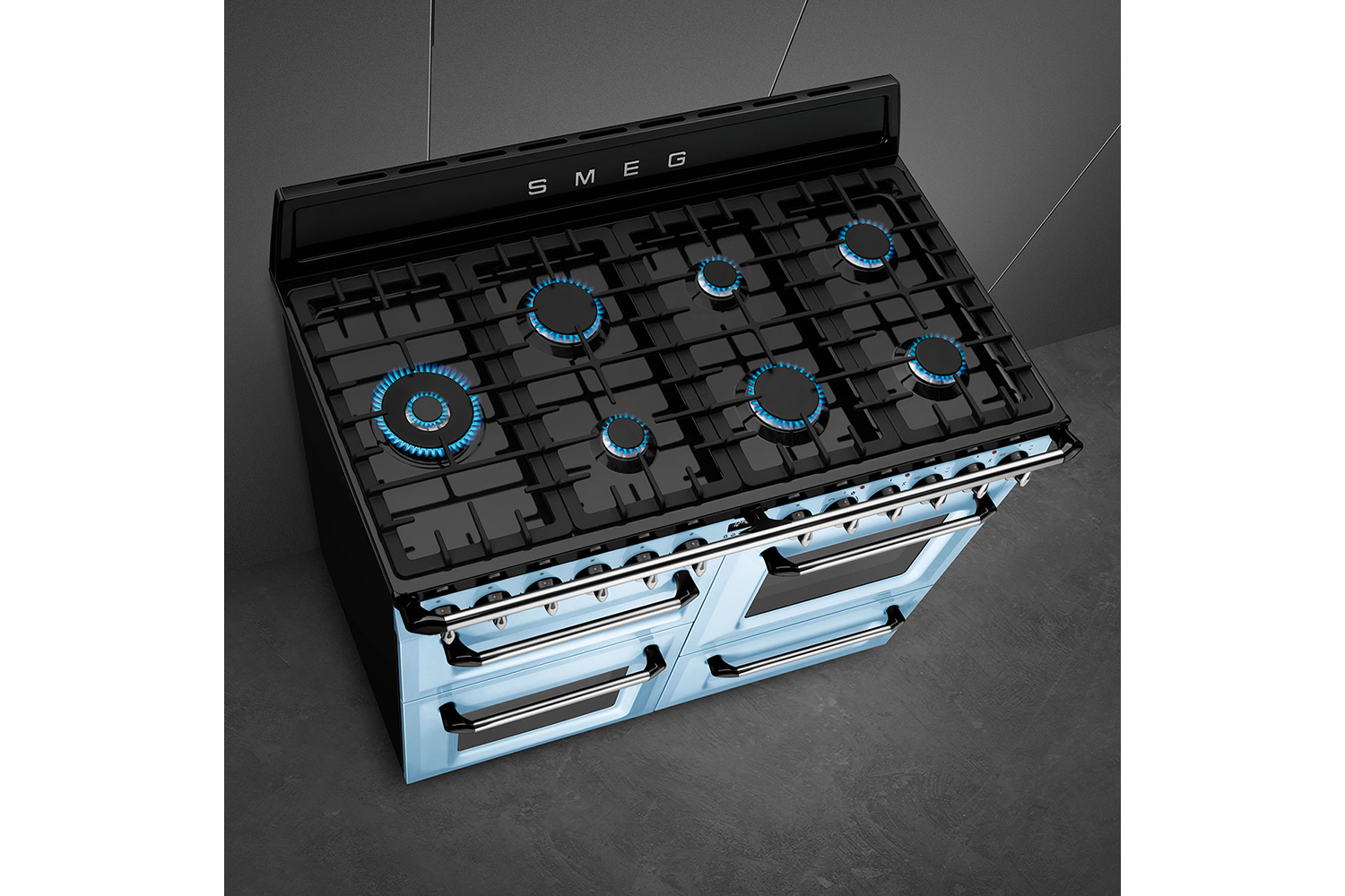 The 110cm wide dual fuel TR4110 cooker features an award winning multifunction main oven and auxiliary oven, both offering conventional and fan cooking. They each have a generous 61 litre net capacity, 4 shelf positions and feature side opening doors. In addition, there is a separate 36 litre fully variable grill for controllable closed door grilling on two levels, as well as a convenient pullout storage drawer for pans and baking trays.