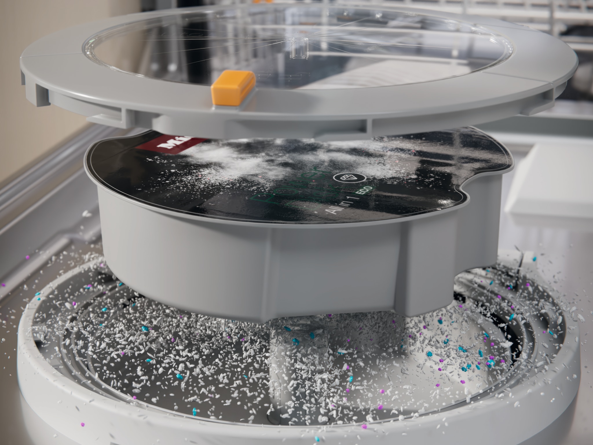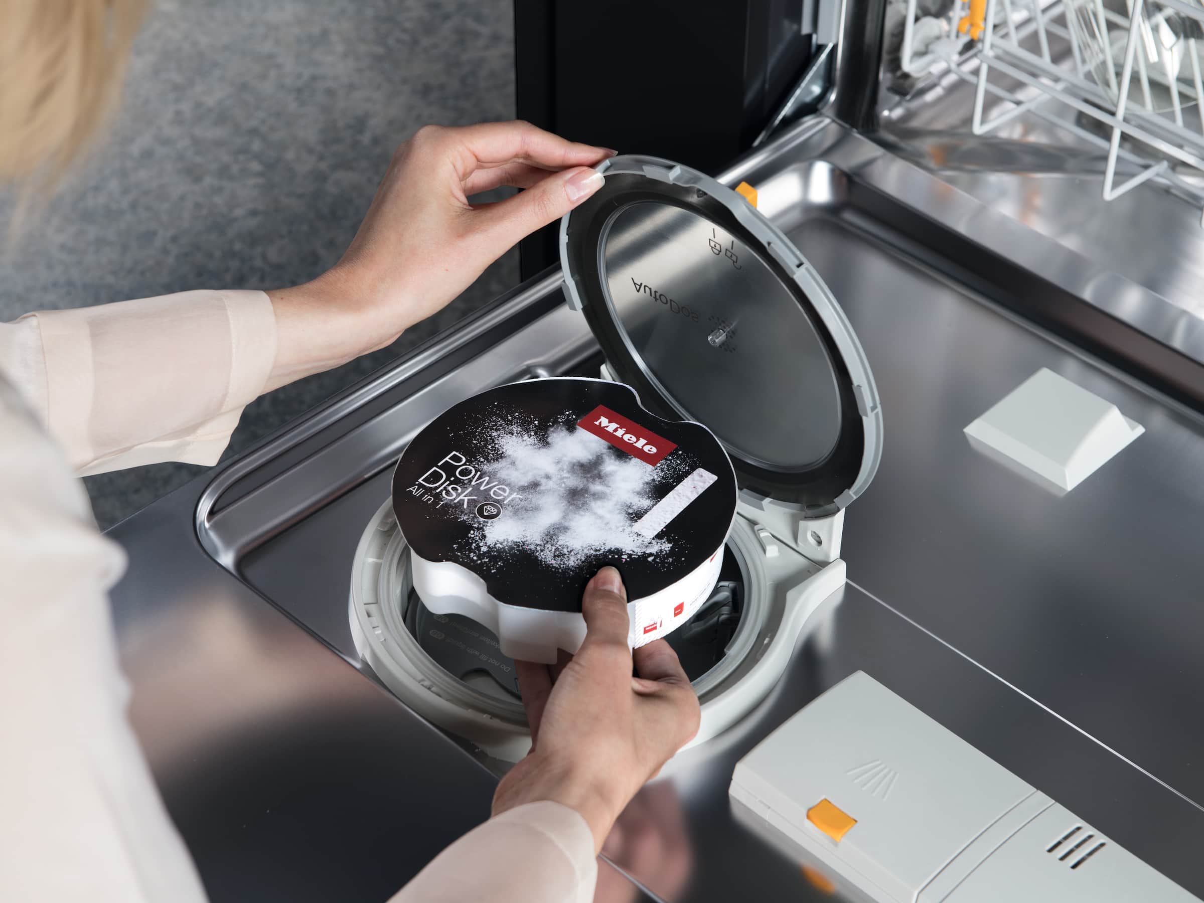 No more manual dispensing: the granulate from the PowerDisk is dispensed automatically in the dishwasher.