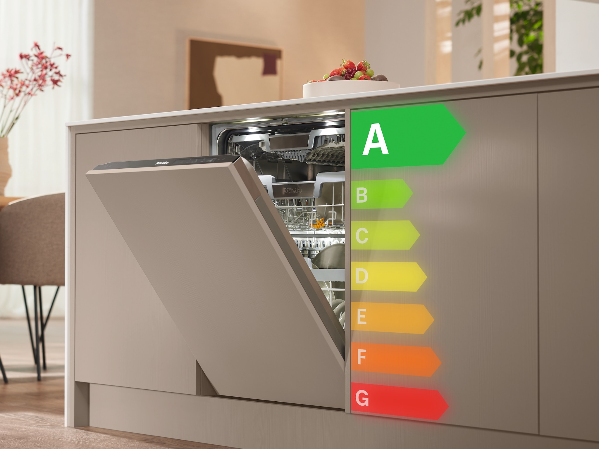 The energy label provides information on the running costs and performance of a dishwasher at a glance. Miele appliances combine perfect cleaning and drying results with very low electricity and water consumption. Appliances in energy efficiency class A meet all the requirements in terms of energy and water efficiency, saving you money and protecting the environment at the same time. An excellent choice.