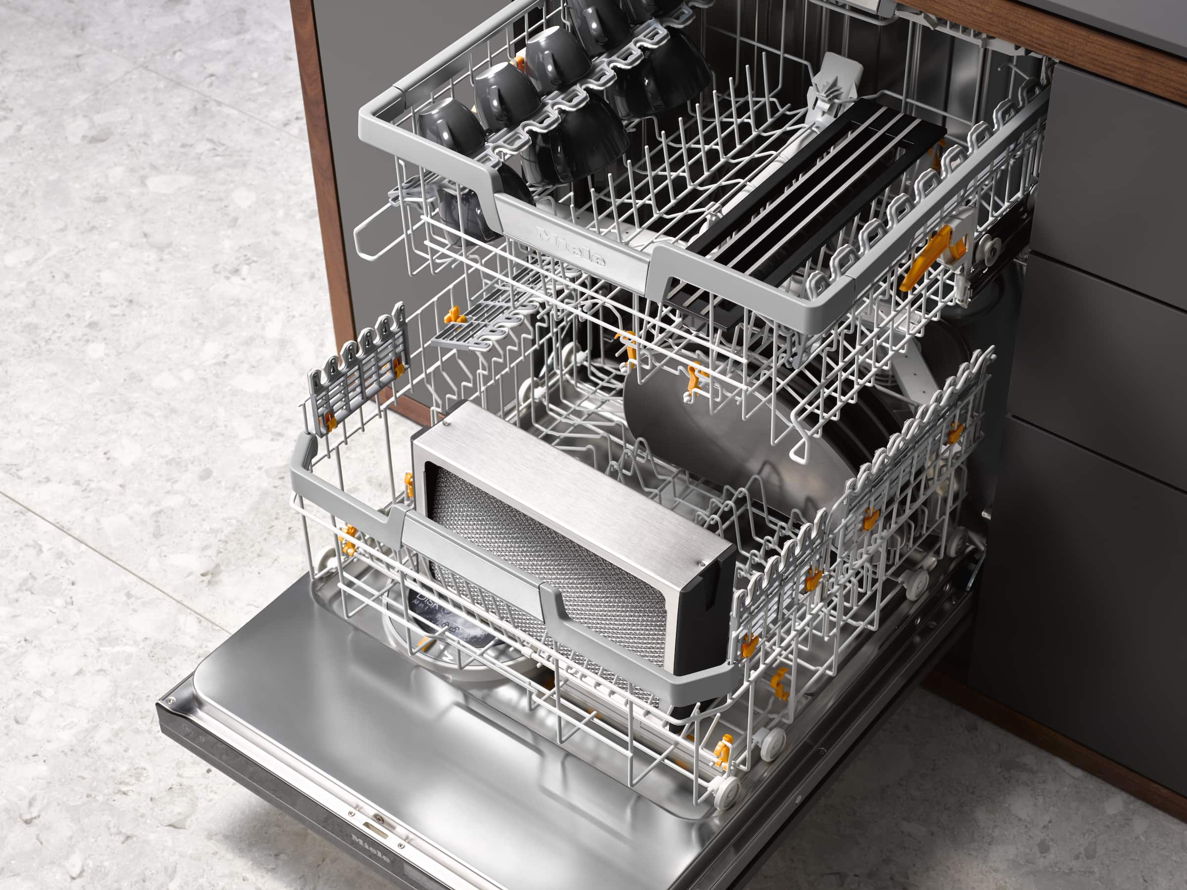 Whether it’s bowls, ovenproof dishes or pots – even bulky items are held securely in the dishwasher basket thanks to XL Assist. Large items can be positioned quickly in the lower basket and small bowls are easily placed below them. Both sets of items are thoroughly cleaned. The Miele XL Assist is flexible and can easily be folded down if not used. This means that you can perfectly load your Miele dishwasher with all kinds of items.