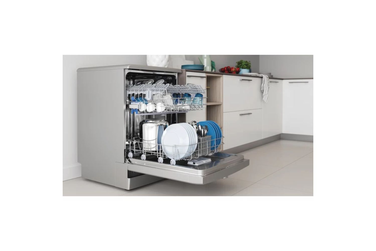 This Indesit Dishwasher features: full size dishwasher with an outstanding number of available place settings. Exceptional, reduced water consumption. Silver colour. Adjustable feet, for perfect stability on uneven floors and surfaces.