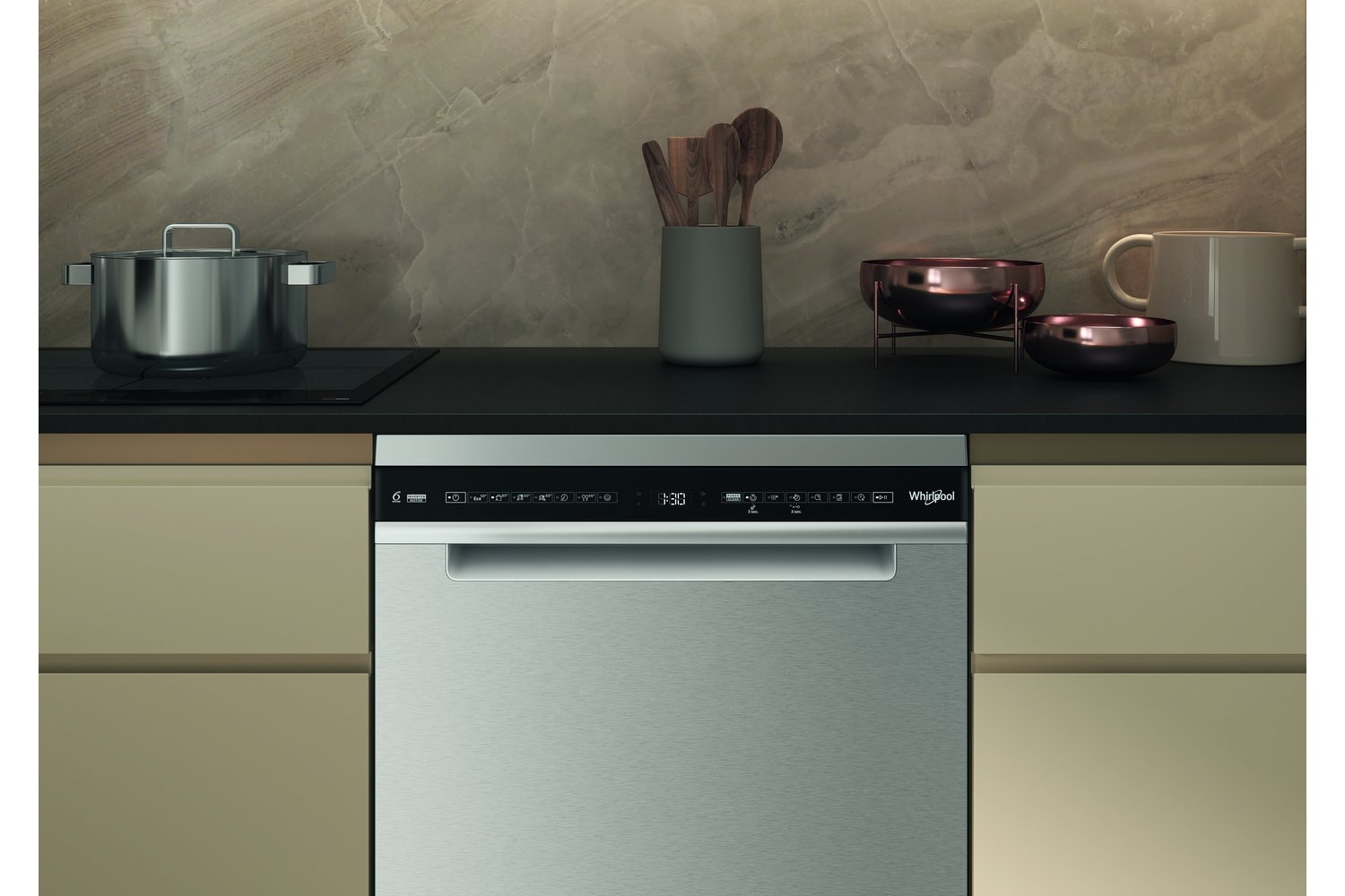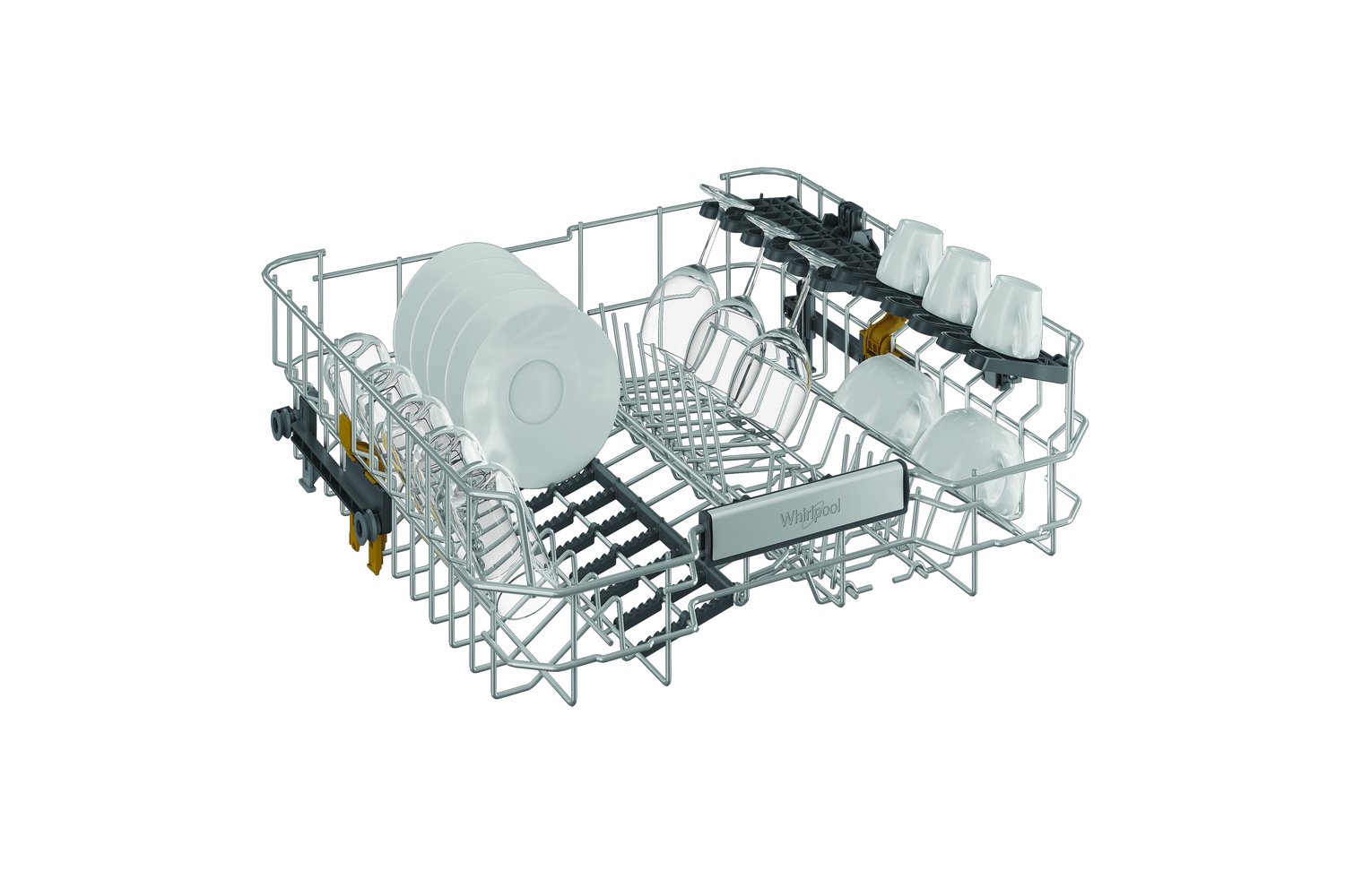 Whirlpool largest revolutionary 3rd rack perfectly designed and angled provides extra room to load mugs, bowls, long kitchen tools or tall glasses up to 13 cm in this unique space. The removable cutlery tray offers extra loading flexibility. Integrated water jets reach all corners of the rack ensuring perfect cleaning.