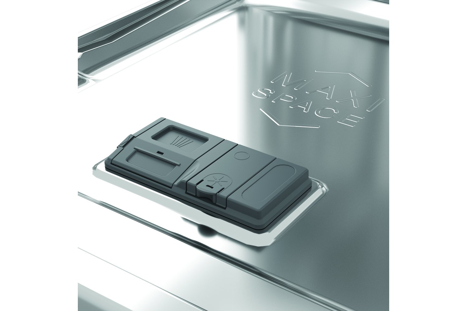 A spacious tub that offers +10% inner space to load even pizza plates up to 32 cm in the lower rack and dessert plates up to 19 cm in the middle one at the same time. No more items left in the sink, no more extra washing and extra consumption.