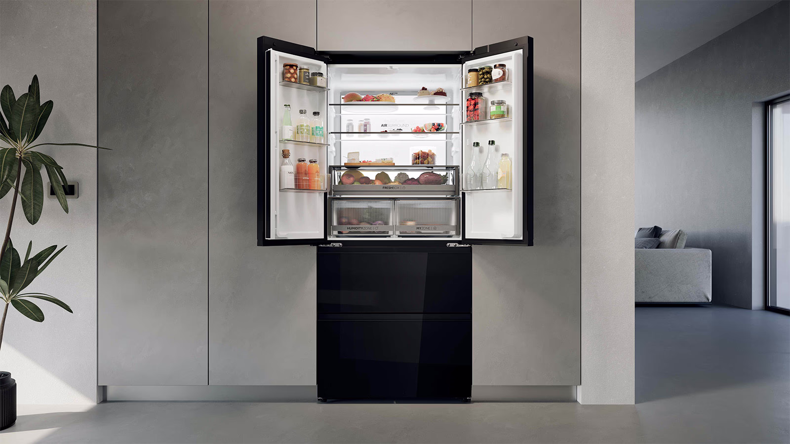 With Haier Air Surround Fresher Tech, the air flows all around the refrigerator in a more gently and soft way. Thanks to the special lateral outlets, from where the air is spreaded, this system homogeneously distributes cold air embracing the food in the whole fridge cavity thus avoiding direct flow on food and without causing weight loss and food drying. That’s why Haier Air Surround maintains food taste, consistency and juiciness up to 99%* after 7 days like Day 1.