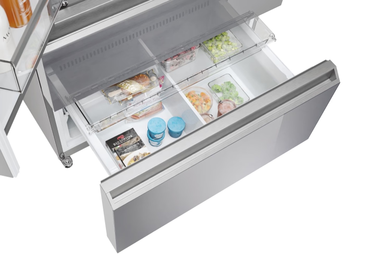 The capacity of this fridge freezer is very impressive while not being much larger than similar fridge freezers. The 2 large freezer drawers mean large items like pizza boxes or roasts fit in very easily and the ice maker is great. The fridge side is huge and the full lighting makes it easy to see what’s inside. Very impressed all round.