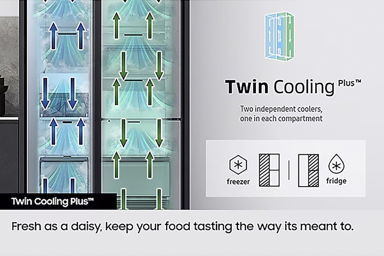 Keep food consistently cool and save energy. The new high-efficiency Al Inverter Compressor's improved structure increases the radius of the rotating parts. Its increased inertia, which is 4.1x higher than a Samsung conventional compressor*, means it can operate for longer using less energy. Using an Al algorithm, it also adjusts the speed of the compressor to suit the user's usage patterns and save energy**. The compressor's durability is also backed-up by a 20 year warranty.