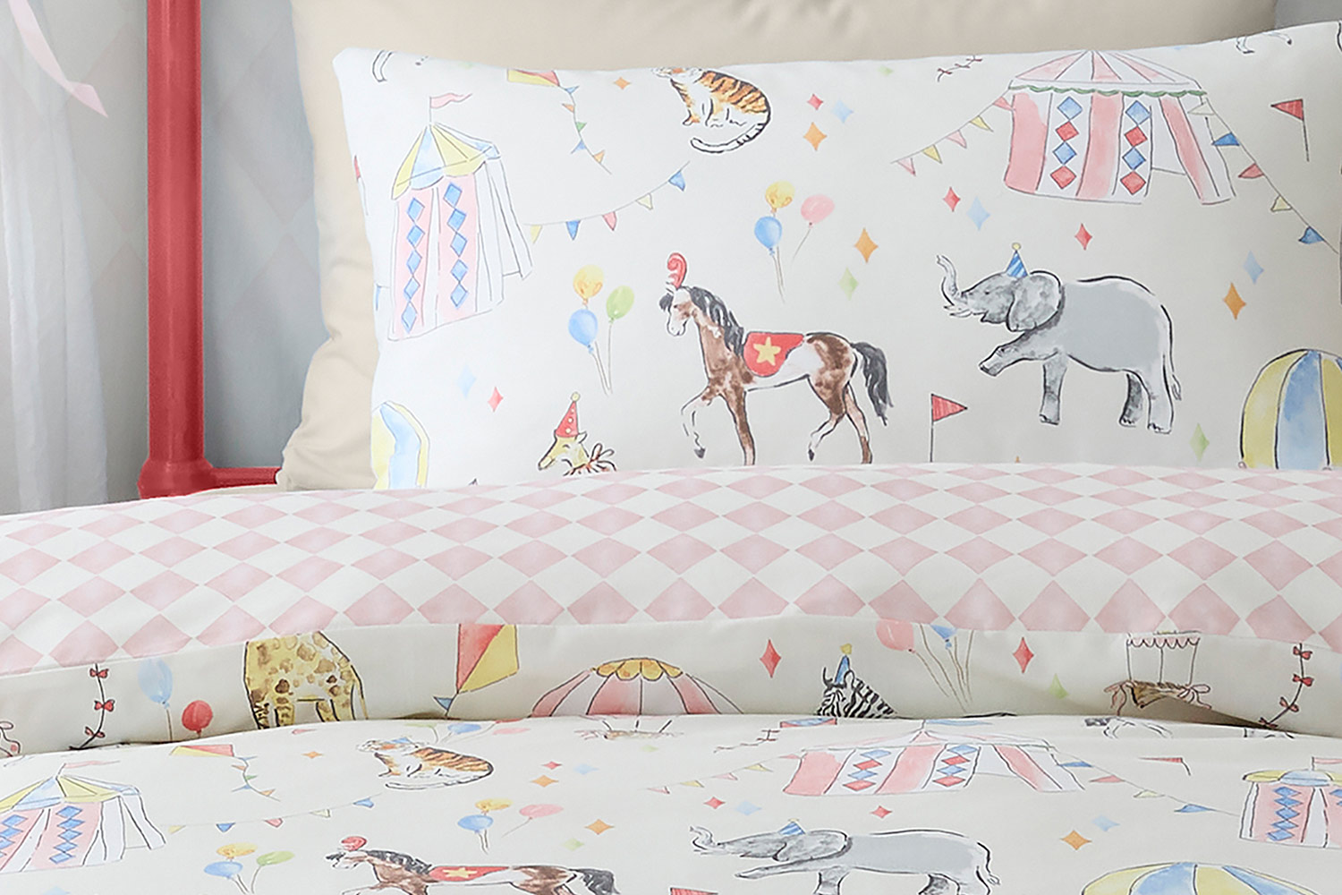 Bring the magic of the circus to bedtime with this whimsical Circus duvet set. Crafted from a cosy blend of soft cotton and durable polyester, this bedding promises comfort and warmth for a good night’s sleep. Adorned with vibrant circus scenes, the duvet features playful animals, colourful tents and balloons in the air, perfect for sparking your child’s imagination. It comes with two matching pillowcases and is available in multiple sizes.
