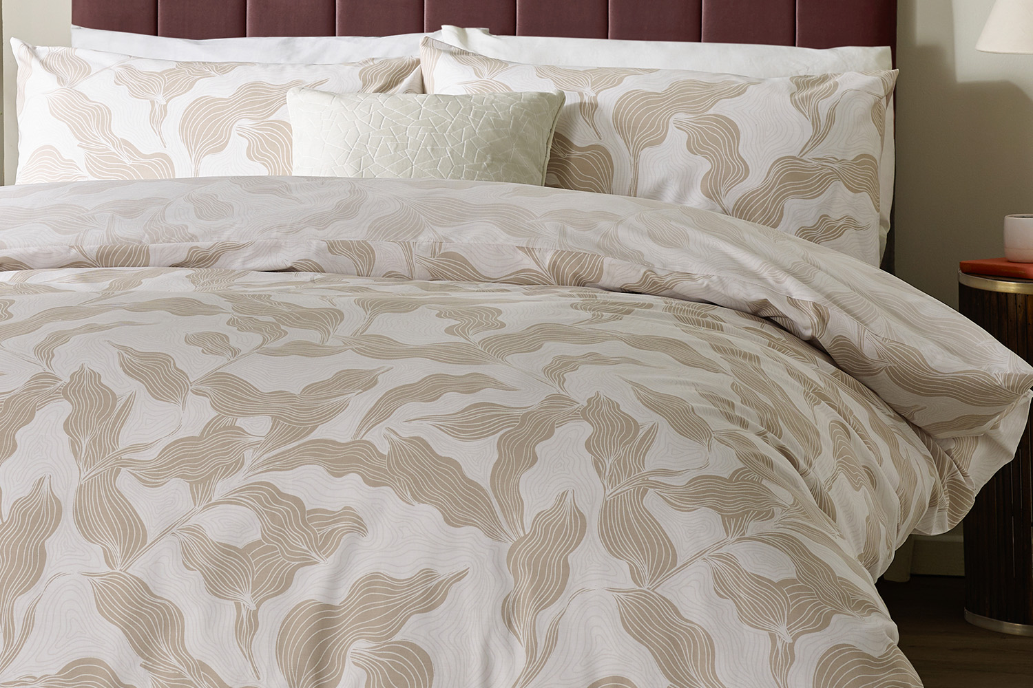 Transform your bedroom into a serene retreat with the Lauro duvet cover set. Crafted from a durable cotton blend with a soft 144-thread count, it pairs comfort with practicality for a dreamy night's sleep. Its reversible design showcases a stunning organic linear pattern inspired by nature's gentle movement, with bold foliage on one side and a more understated leaf motif on the other. Designed for easy care and long-lasting beauty, it’s the ideal way to refresh your bedroom with style and comfort. Available in multiple sizes with matching pillowcases included.