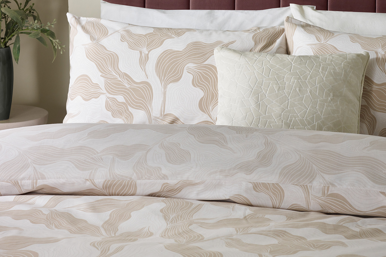 Transform your bedroom into a serene retreat with the Lauro duvet cover set. Crafted from a durable cotton blend with a soft 144-thread count, it pairs comfort with practicality for a dreamy night's sleep. Its reversible design showcases a stunning organic linear pattern inspired by nature's gentle movement, with bold foliage on one side and a more understated leaf motif on the other. Designed for easy care and long-lasting beauty, it’s the ideal way to refresh your bedroom with style and comfort. Available in multiple sizes with matching pillowcases included.