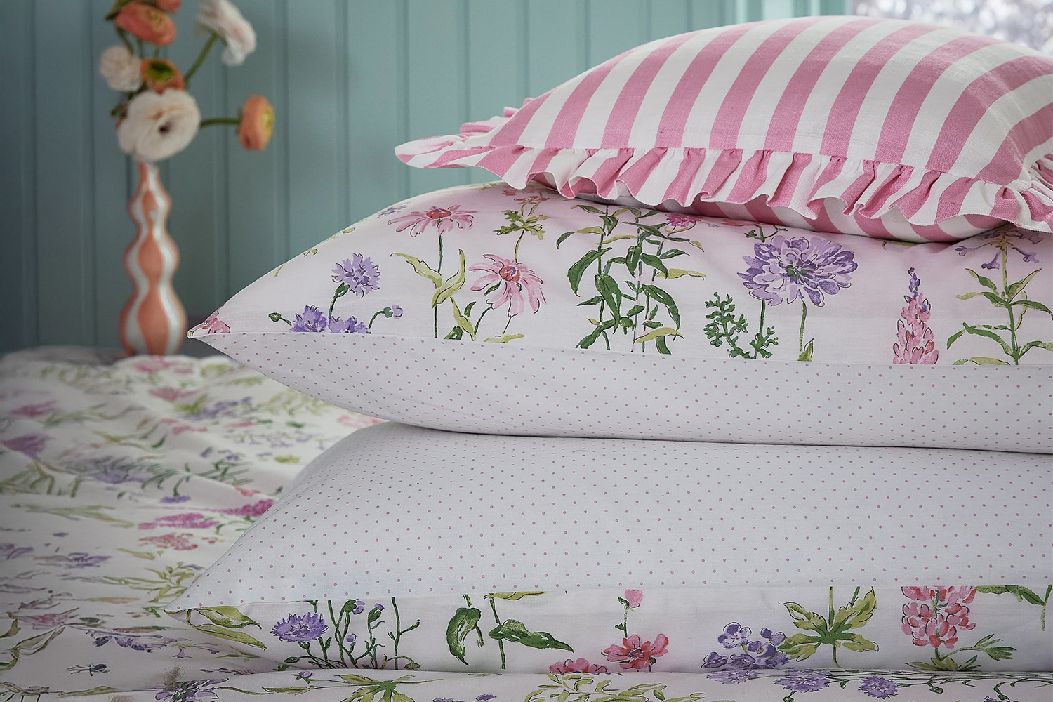 Bring a breath of fresh air to your bedroom with the beautifully detailed Meadow Flower duvet set. Soft, delicate wildflowers are scattered across a crisp, light background, creating a calm, romantic look that feels both timeless and inviting. The gentle palette of lilac, blush, and soft green adds subtle colour without overwhelming the space, making it perfect for relaxed, elegant interiors. Crafted for both beauty and comfort, this duvet set is made from cotton that feels smooth and cosy against the skin. Available in multiple sizes with two matching pillowcases included.
