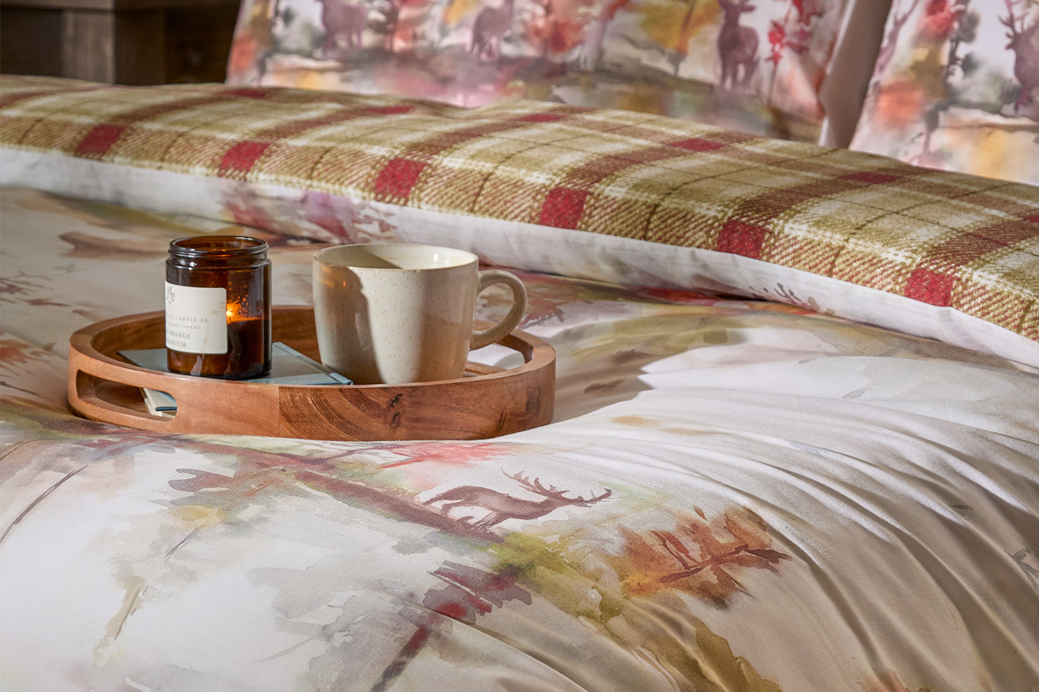 Wrap your bed in rural tranquillity with the Wilderness duvet set, crafted from 100% cotton for that incredibly cosy and soft feeling. Boasting a reversible design, one side features a hazy woodland scene with majestic stags staring across a misty lake, inviting soothing countryside into your home. The other side features a classic tartan, perfect for mixing up your look during the week while keeping that warm
