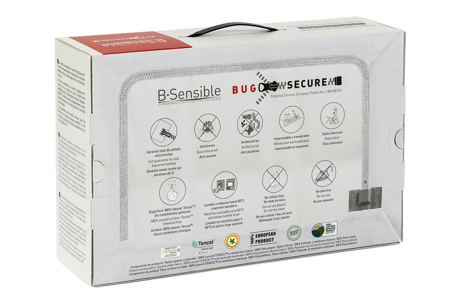 The B-Sensible Bug Secure Mattress Protector is a six-sided mattress protector that encases your whole mattress (including the bottom). This encasement fully protects your mattress against bed bugs, dust mites, liquids, moistures, bacterial and fungal growth. As a result, this protector is perfect for anyone who suffers with allergies, respiratory conditions, eczema, and psoriasis. This protector is 100% waterproof and breathable while also having the benefits of the Tencel fibres.