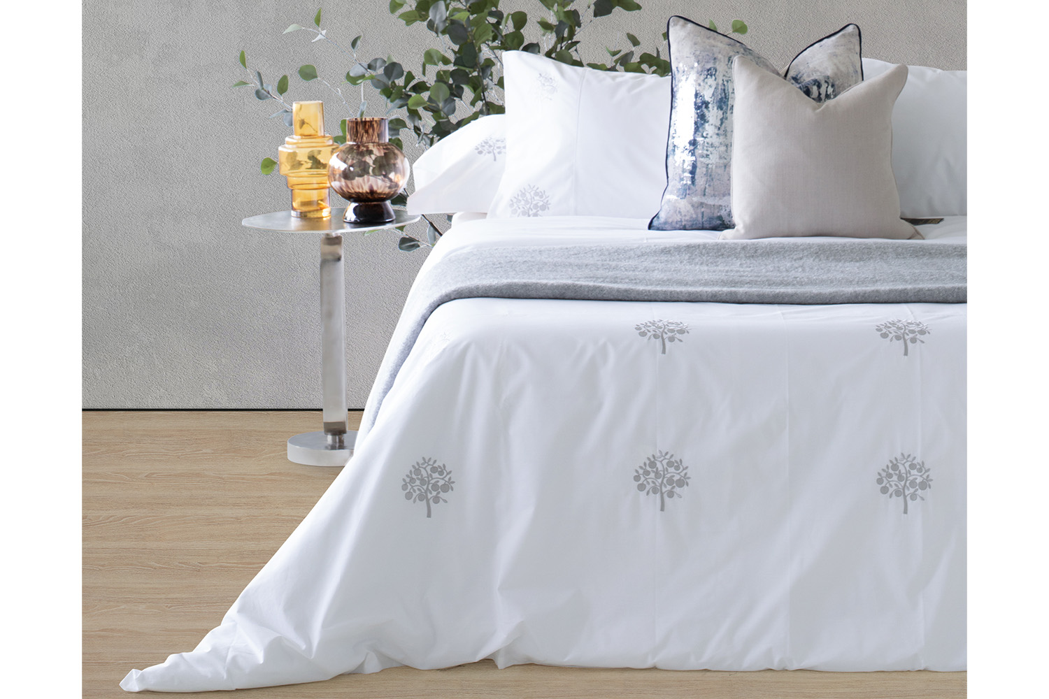 It features a delicate and intricate, embroidered design of silver apple trees against a white background that add an element of refined excellence to any room. This pillowcase is made from 100% percale cotton for optimal comfort and warmth, and has a thread count of 300 for added luxury.
