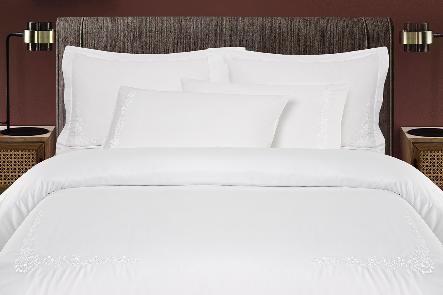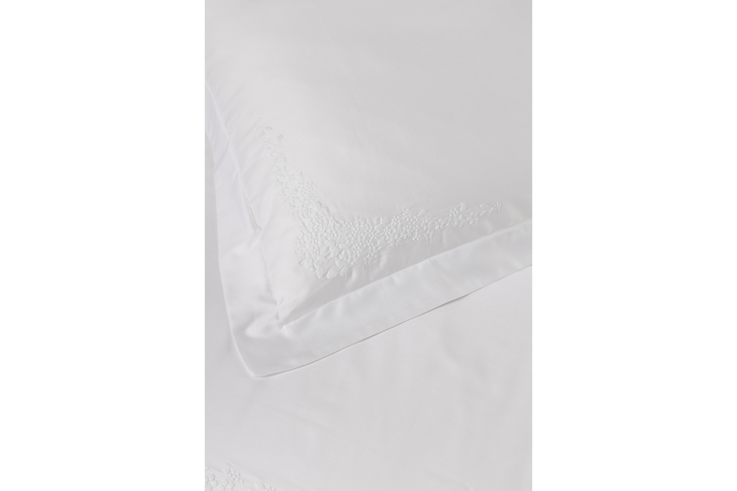 It features a delicate and intricate, embroidered floral design against a white background that adds an element of refined excellence to any room. This pillowcase is made from 100% sateen cotton for optimal comfort and warmth, and has a thread count of 300 for added luxury.
